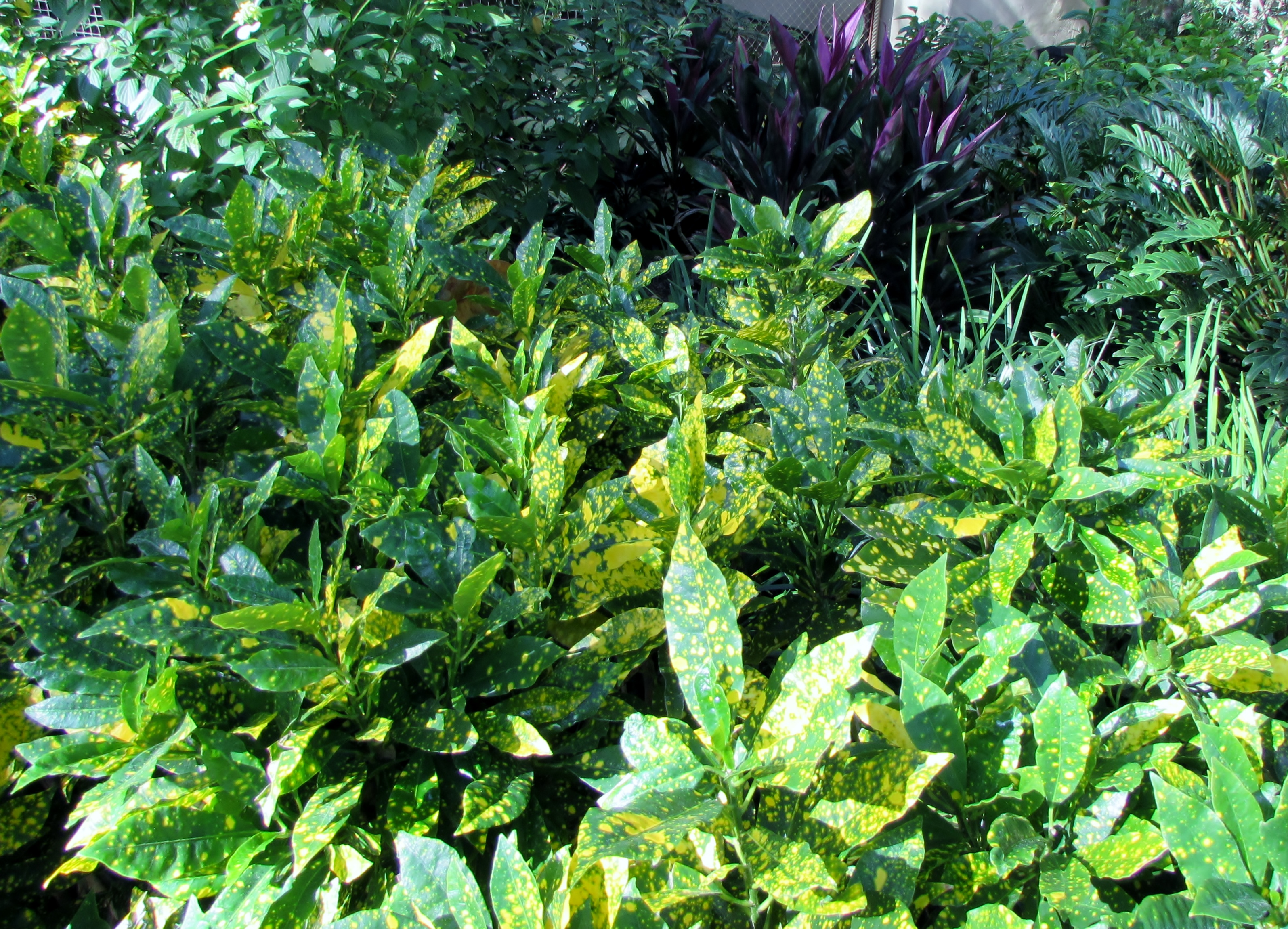 Aucuba Gold Dust, Aucuba japonica ‘Variegata’ is a favorite of mine. It does very well right through our hard freezes. Sometimes the top leaves get burnt but it recovers quickly. And they keep their bright yellow even in shade.