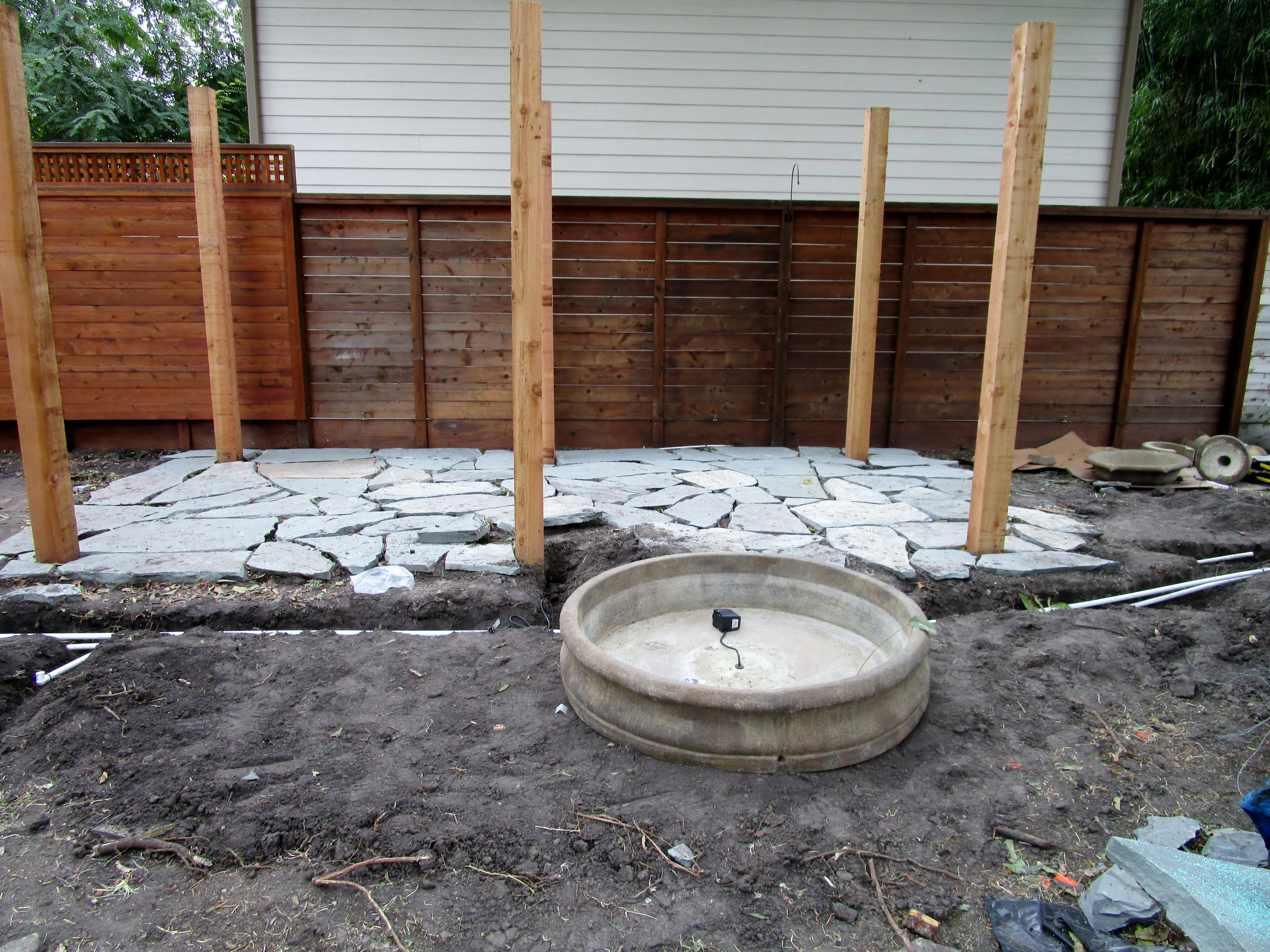 We trenched for the irrigation as we began setting the flagstone.