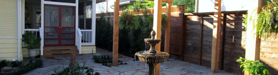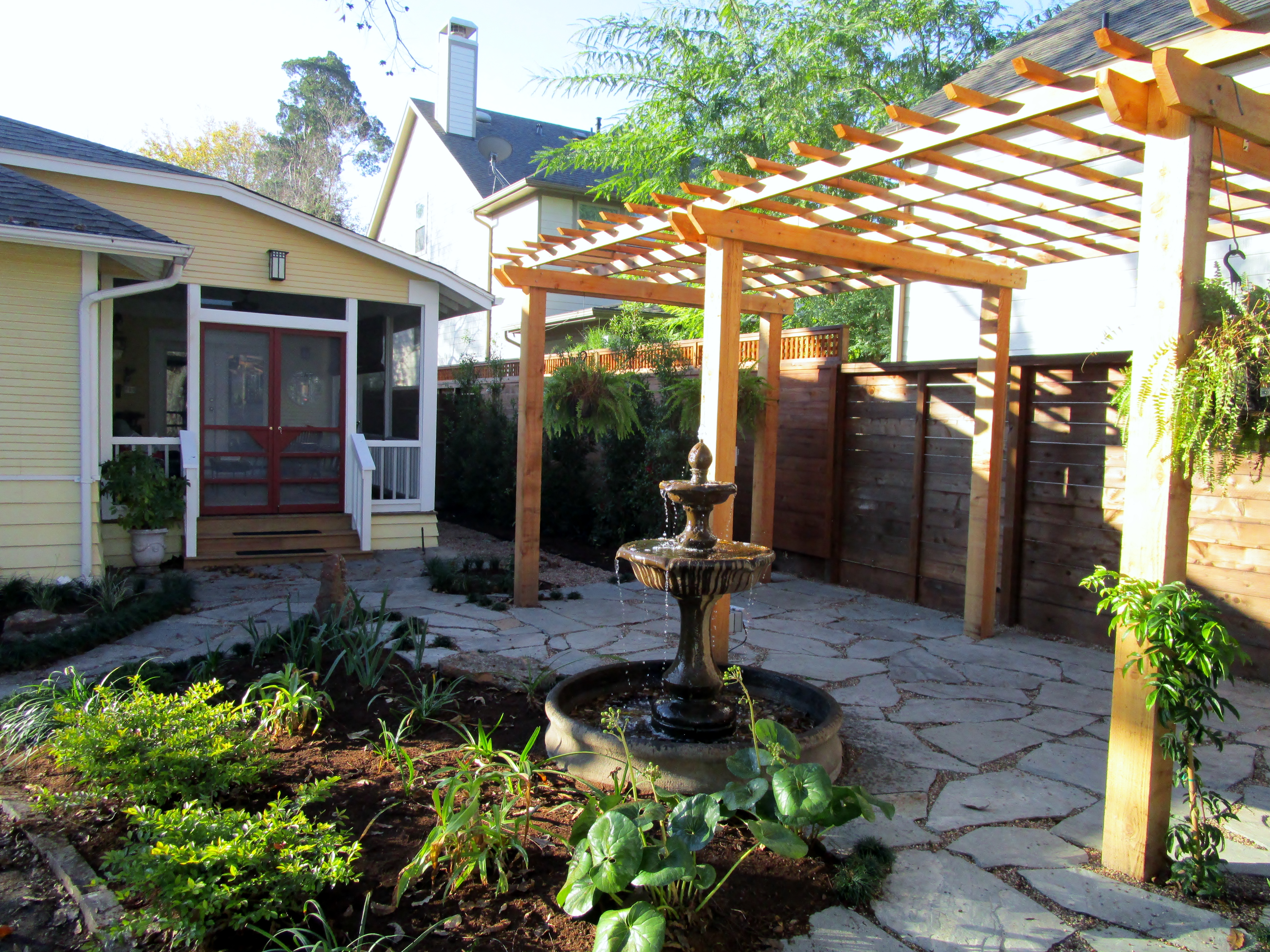 The lovely couple who own this charming bungalow recently moved here and have been updating their new home in the Heights. They were just about to add a screen porch when we first met to talk about the back garden. They wanted a more useful back garden space with room for plantings and a patio with a pergola as another place to sit and entertain.  The yard also needed to be child friendly for their your grandchildren. There was talk of a pond but the maintenance and concern of young children falling in nixed that idea. Instead they found a beautiful fountain that we worked into the design. We used thick flagstone set into dirt for the patio and paths that flow from the porch to the patio and gravel driveway.