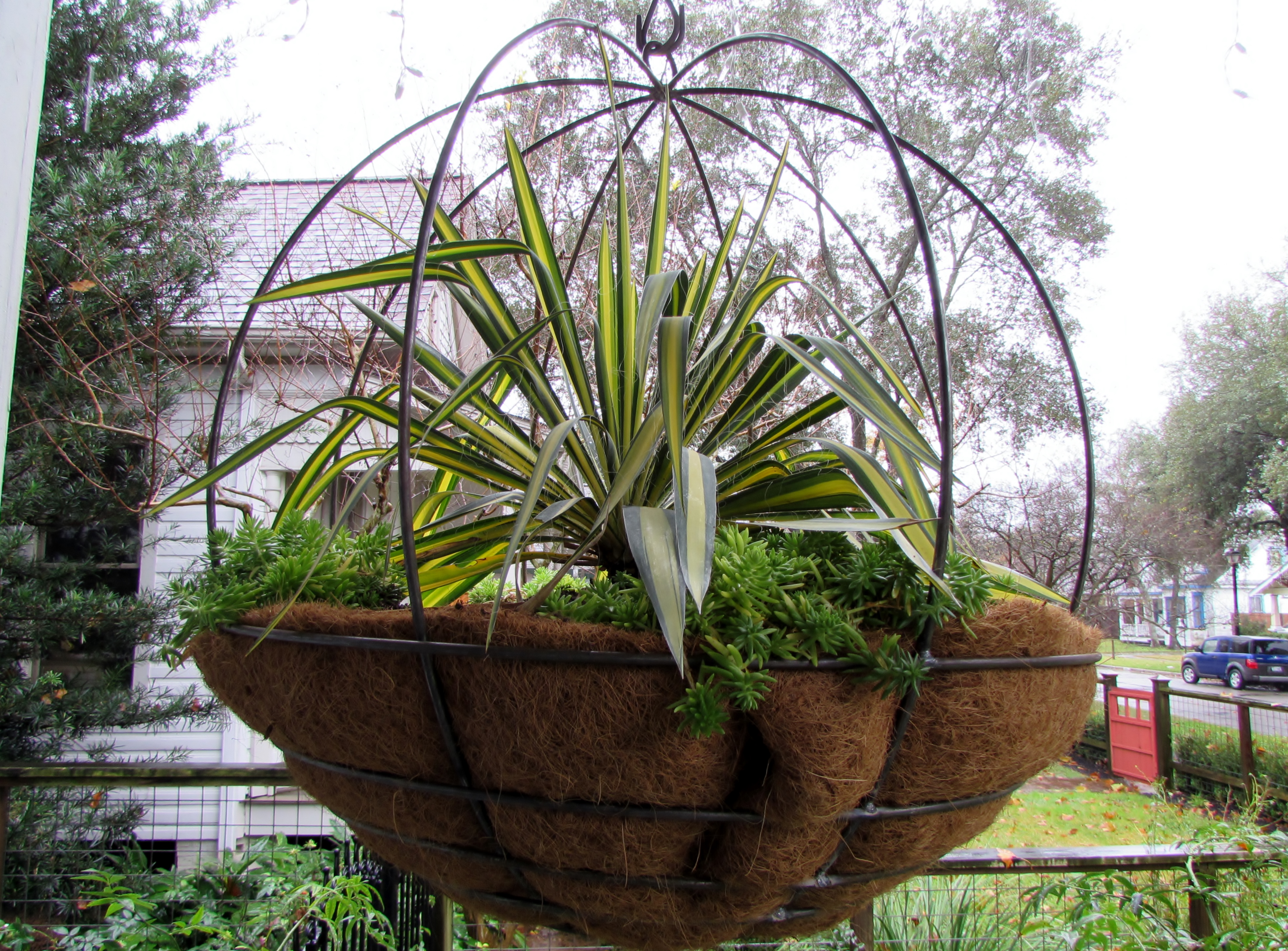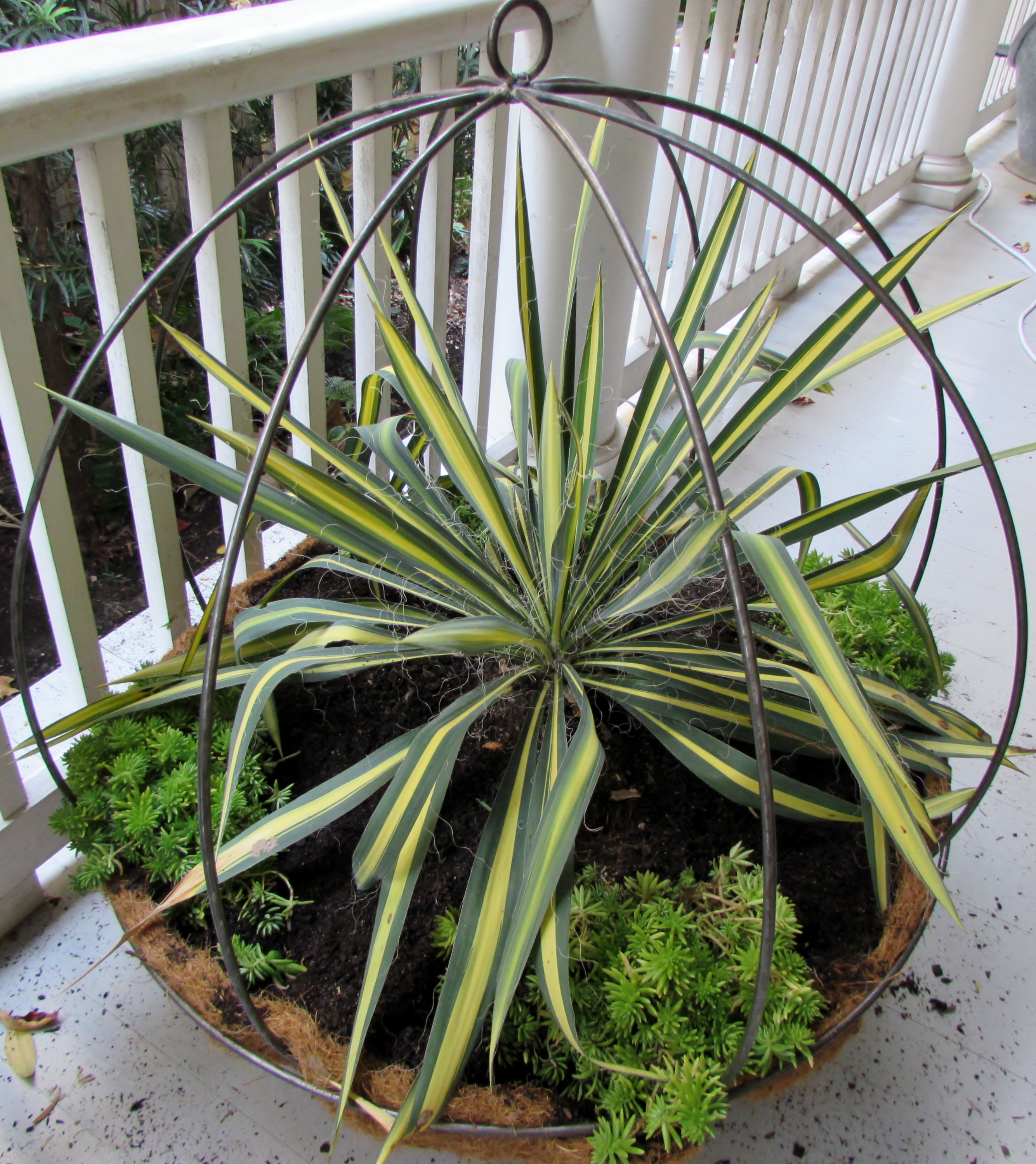 hanging basket planterI am not sure where I first saw these metal hanging baskets but it was instant lust. They come in several sizes from the online shop Terrain. I started with a small, medium and large one. When I went back to order one more I accidentally ordered this giant one.  I was considering it but worried it might be too big. Guess I left it in my cart. I know, I could have returned it but that thought didn’t last long. Then what to plant in it? I already knew I wanted to hang it at the other end of the porch where there is good light. Looking out at our orphaned plants and talking to Shawn we decided to try one of the Color Guard yucca. It will surely have good drainage hanging.