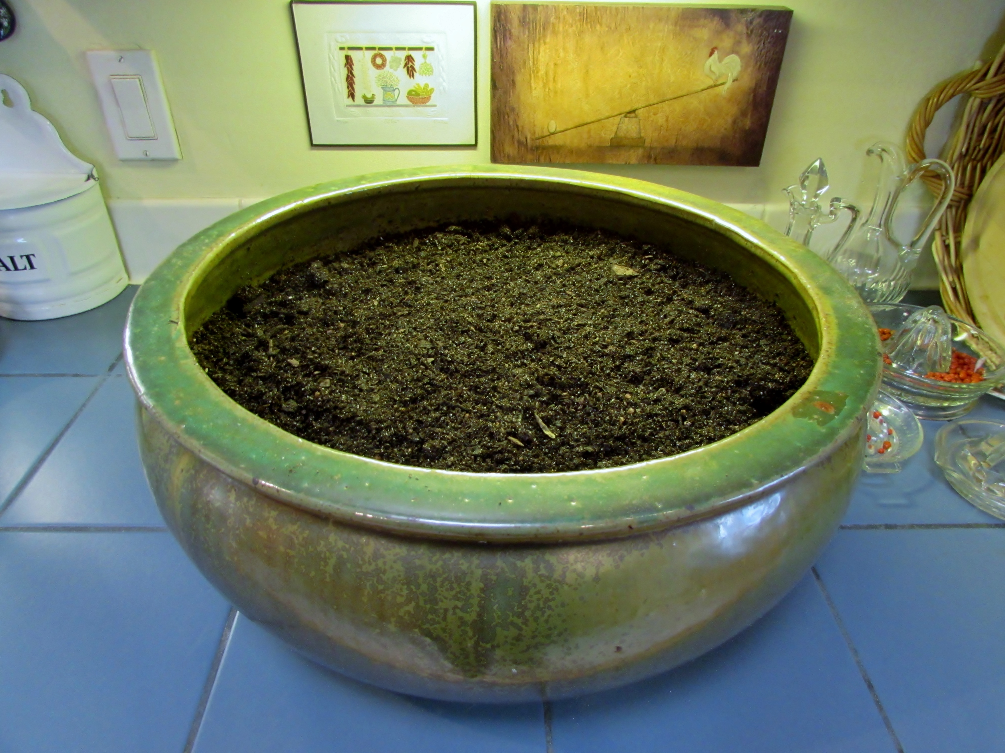 I started with a pot that was big enough to fit my scene. I was planing to construct it outside on my potting bench but it was too cold. Shawn put the soil in and brought it inside for me. I am very grateful!