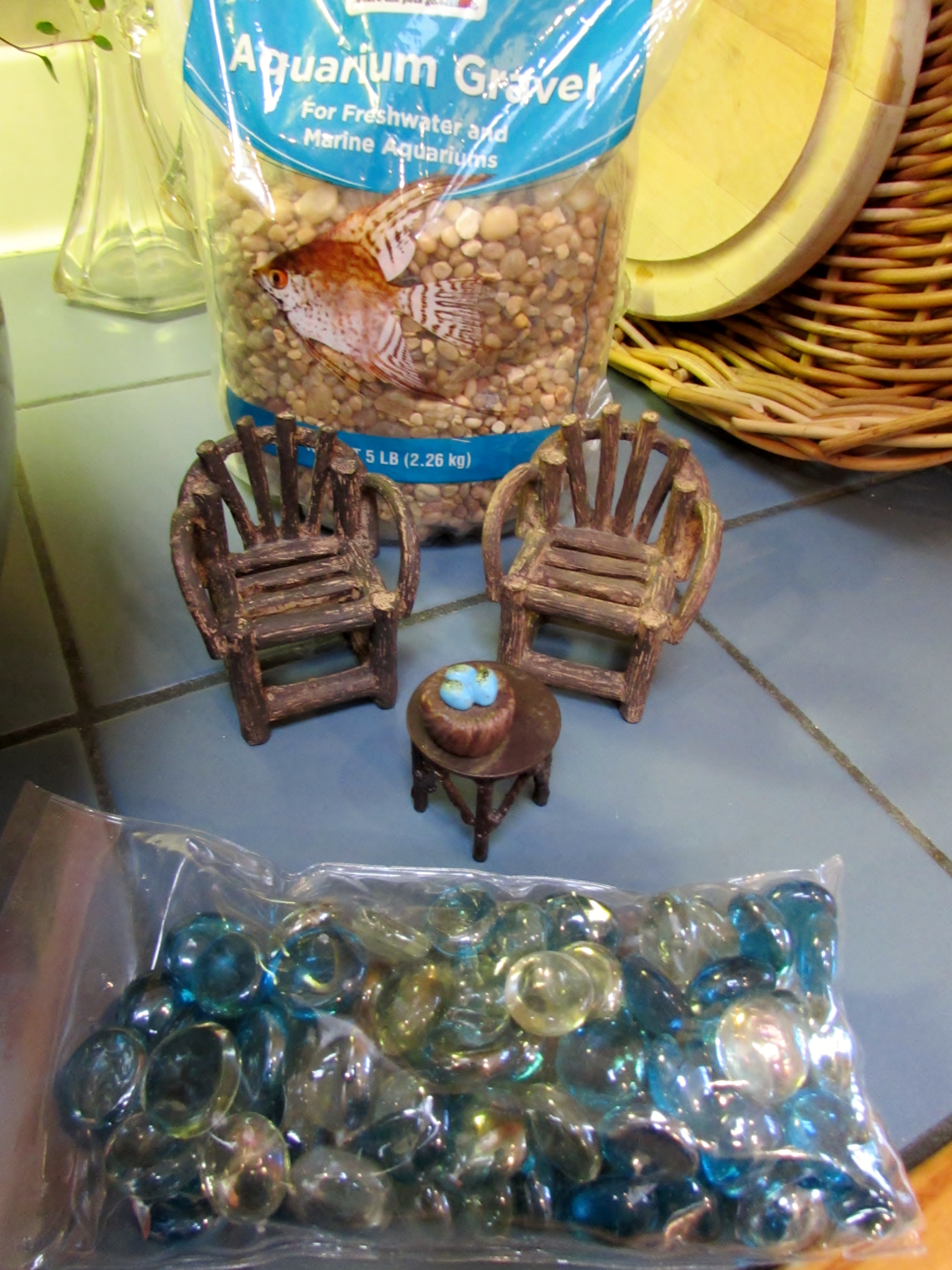 Next I needed miniaturize rocks and something to give the effect of a pond. By this time I had realized I wanted to have it look like a tiny woodland. I found just what I was looking for at a local Petco in the aquarium section.