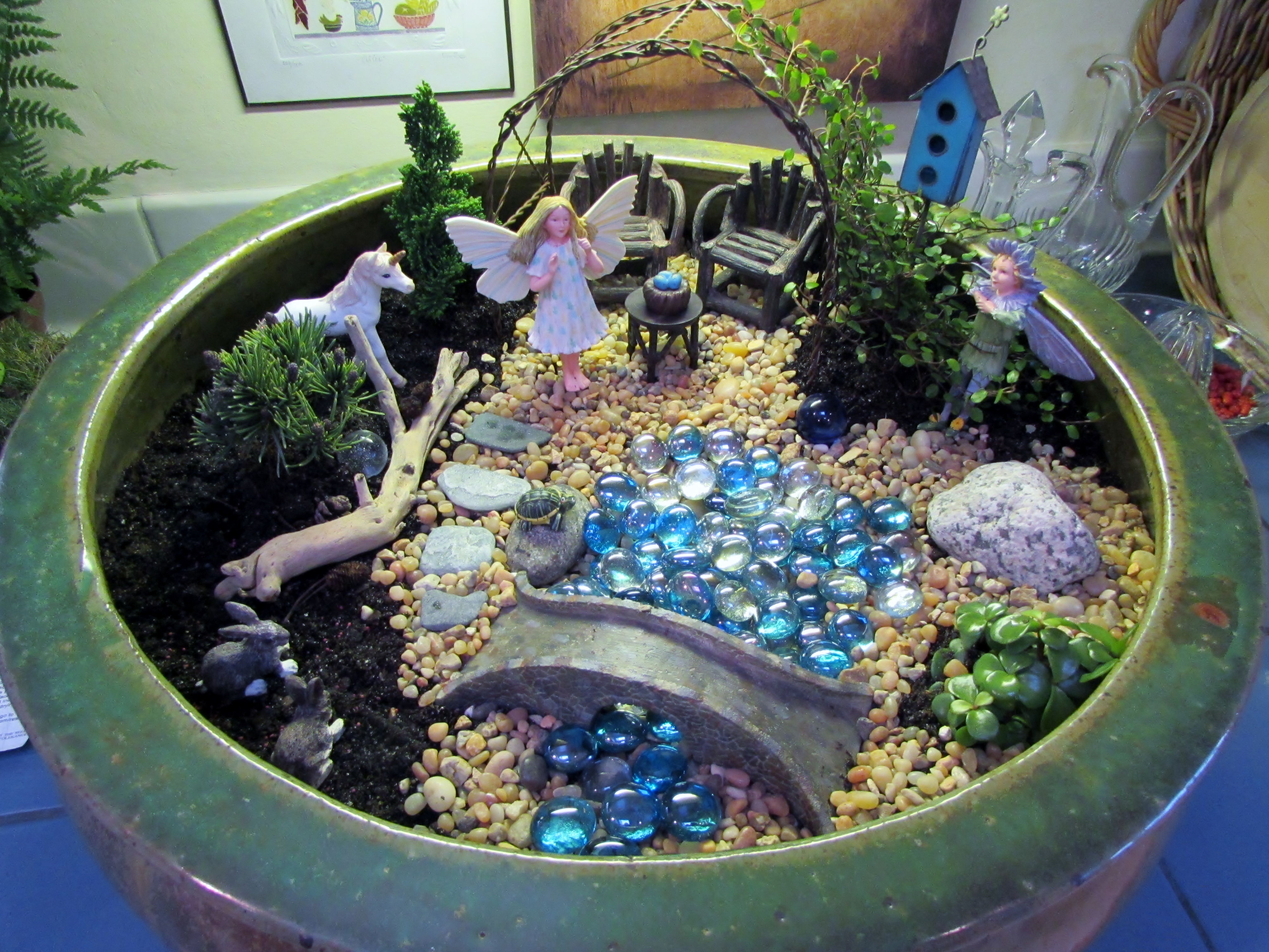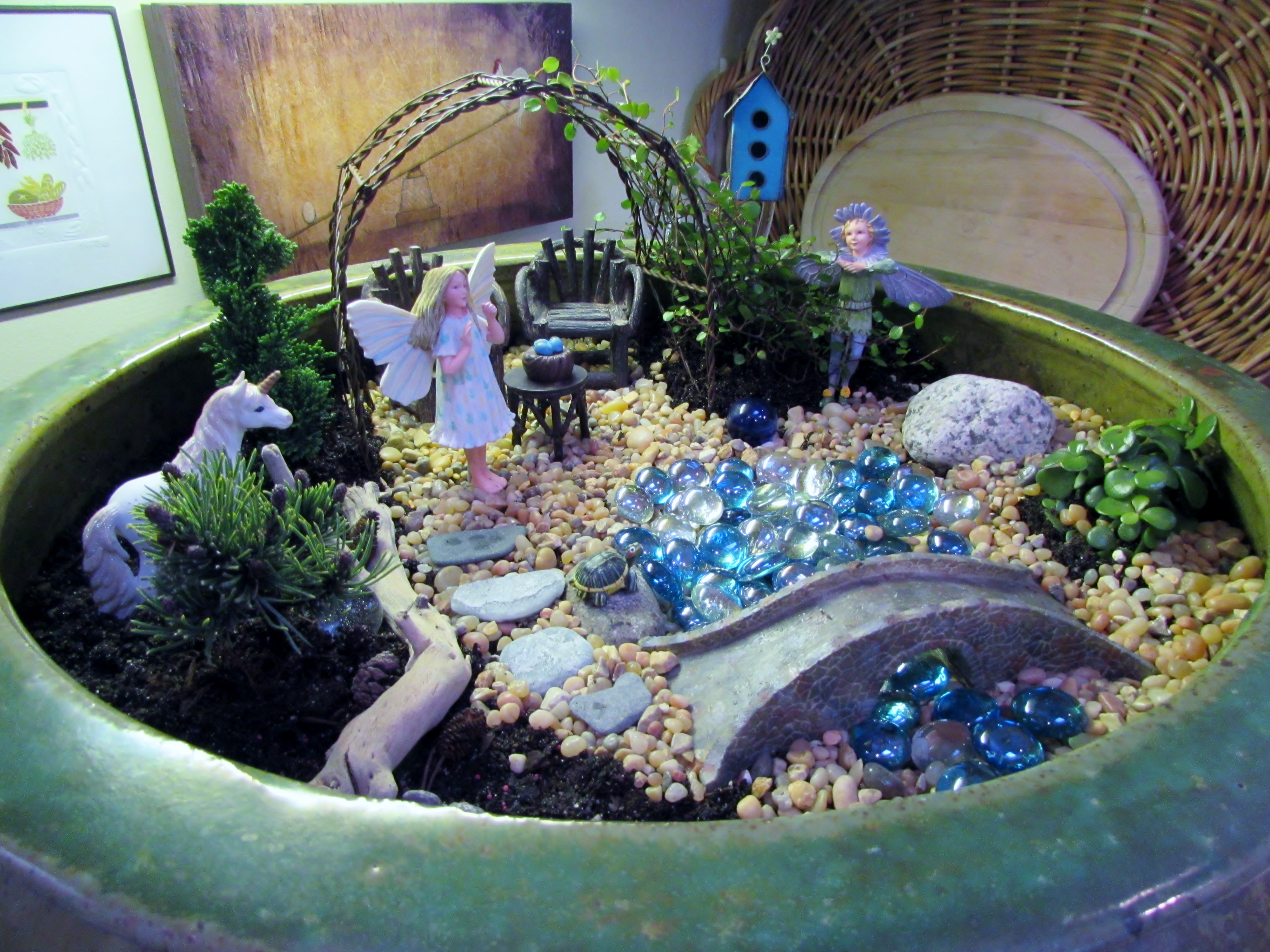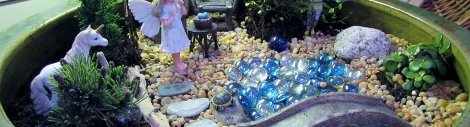 After reading the book, I started by looking around my house for little things that might work in a miniature garden. I already knew the theme would be fairies. I found a few rocks, big marbles, a nice piece of driftwood that looked like a miniature log and some tiny pine cones. Next I went to a local nursery, called Another Place in Time, to see about figurines and furniture. They always seem to have fun miniature items when I am there. They didn’t have a unicorn but I found one on Amazon : )