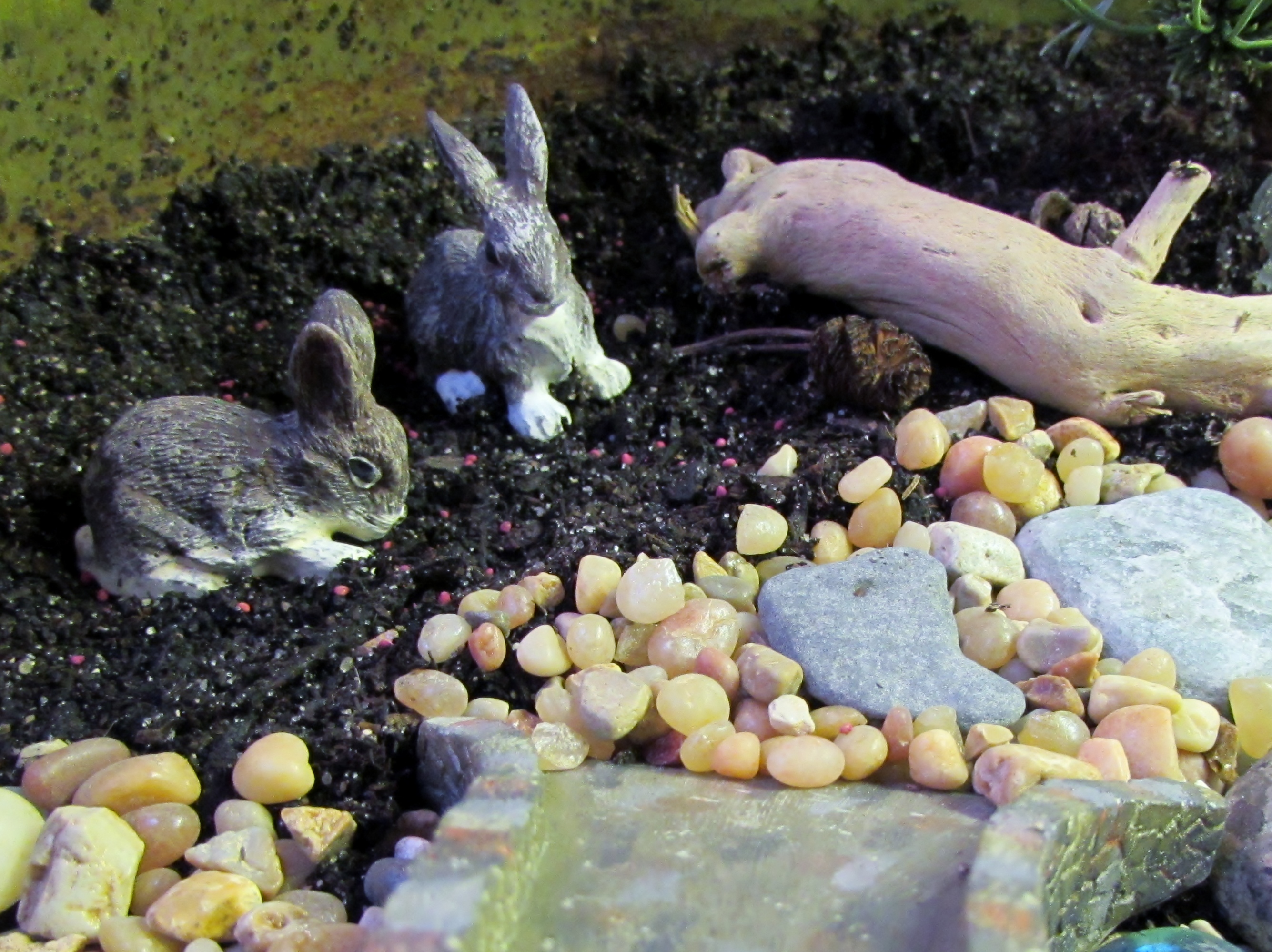 I love the little rabbits. I scattered some mini clover seed around them. I hope it will grow. These little rabbits remind me of my two little cement rabbits that hide in my liriope. I do imagine them becoming real at night and running around the garden. This thought makes me realize play is a big part of being a designer. When I am creating I am playing with ideas, shapes, colors, textures, themes and then working to bring them all together in a cohesive plan.