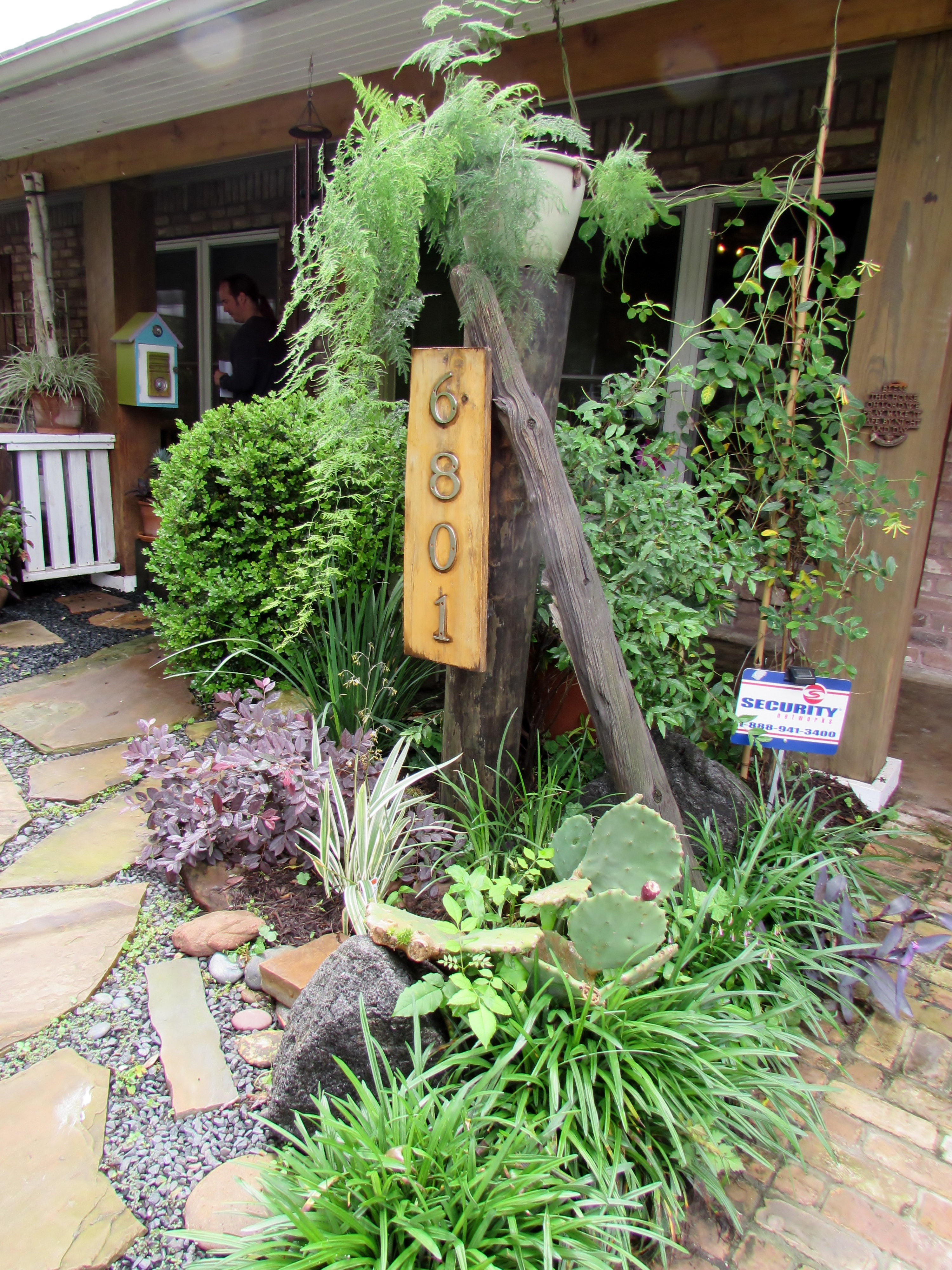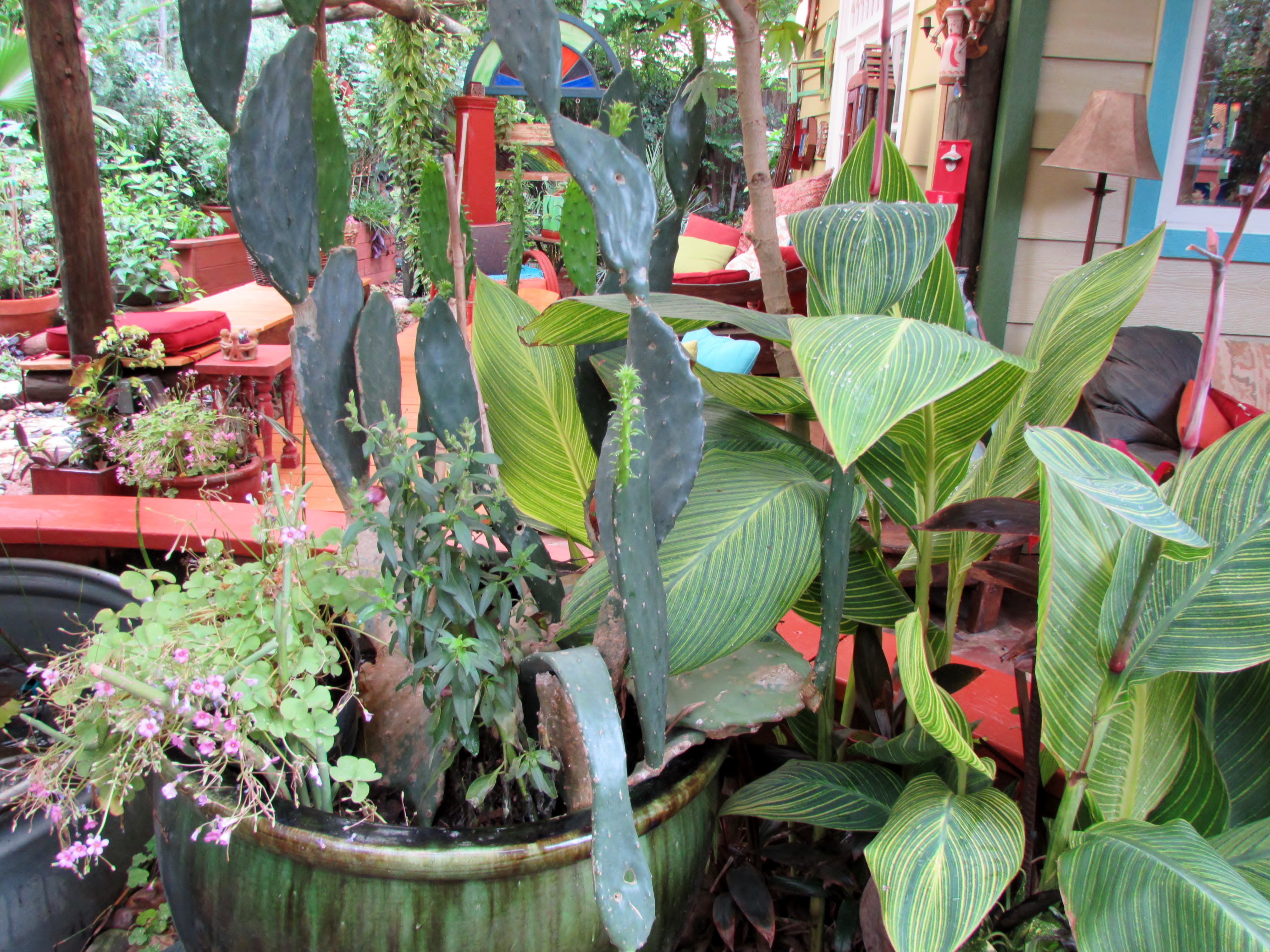 This garden is a series of vignettes and rooms each with its own charm. There are places to sit and soak up nature at every turn. I have known or known of Jeff River Law since I moved to the Heights 16 years ago. He had a wonderful shop called October Gallery on 19th Street. Every Sunday I would walk to Kaldi Cafe for brunch and then pop over to have a look round his shop. It was my favorite place to go gift shopping. He featured handmade items from local artists. It has been years since he sold the shop and went off on an adventure. I next saw him when he bought a property in the Heights with an old quonset hut on it. He called it Indian Summer Lodge; it was a mixed use space. It was only then that I saw his gardening style. Fun, artistic, eclectic and all using only hardy low maintenance plants that love our climate. It backed up to the walking trail that leads from the Heights to downtown Houston. You can still see many of the plants thriving there with no human attention.