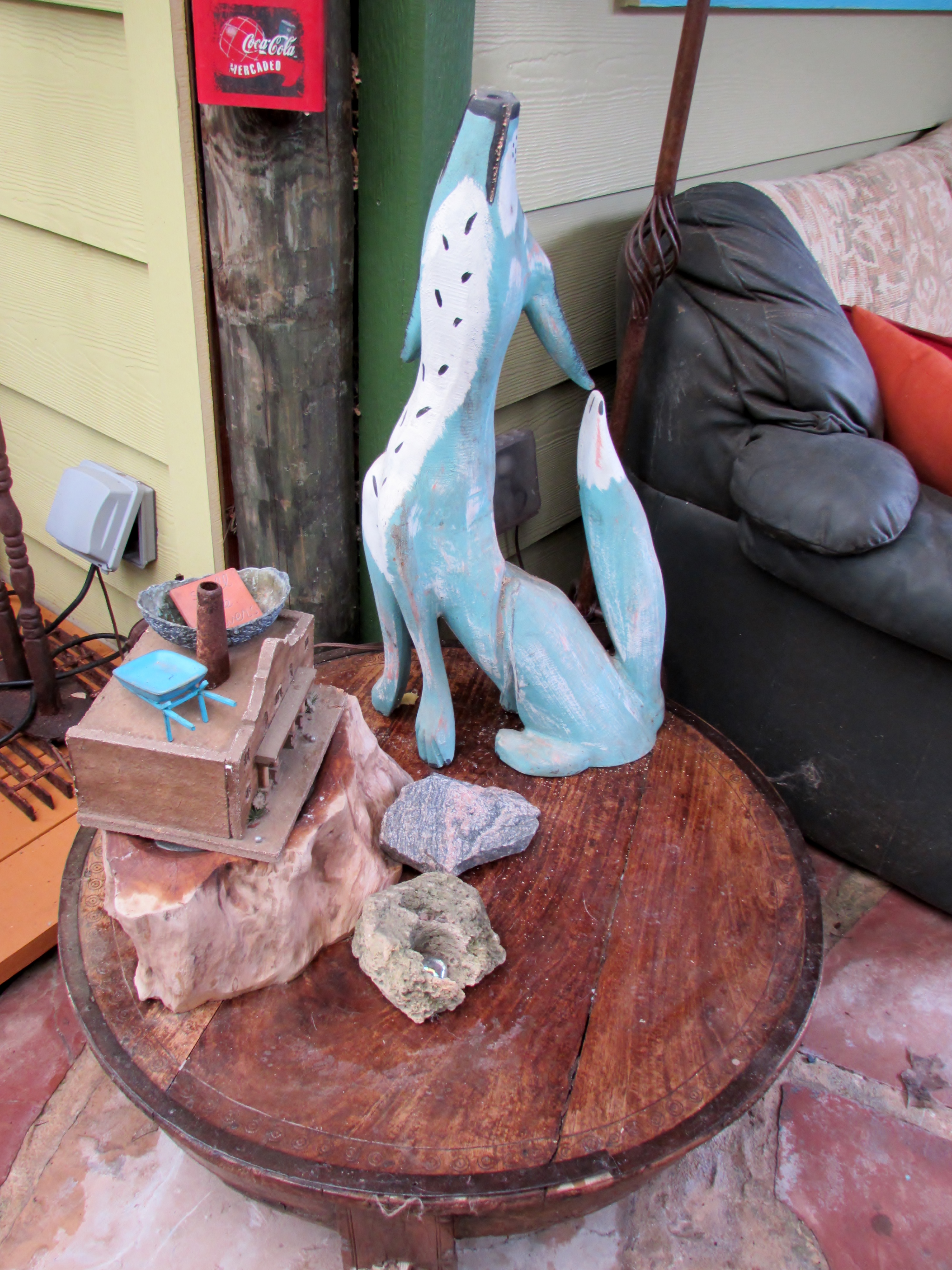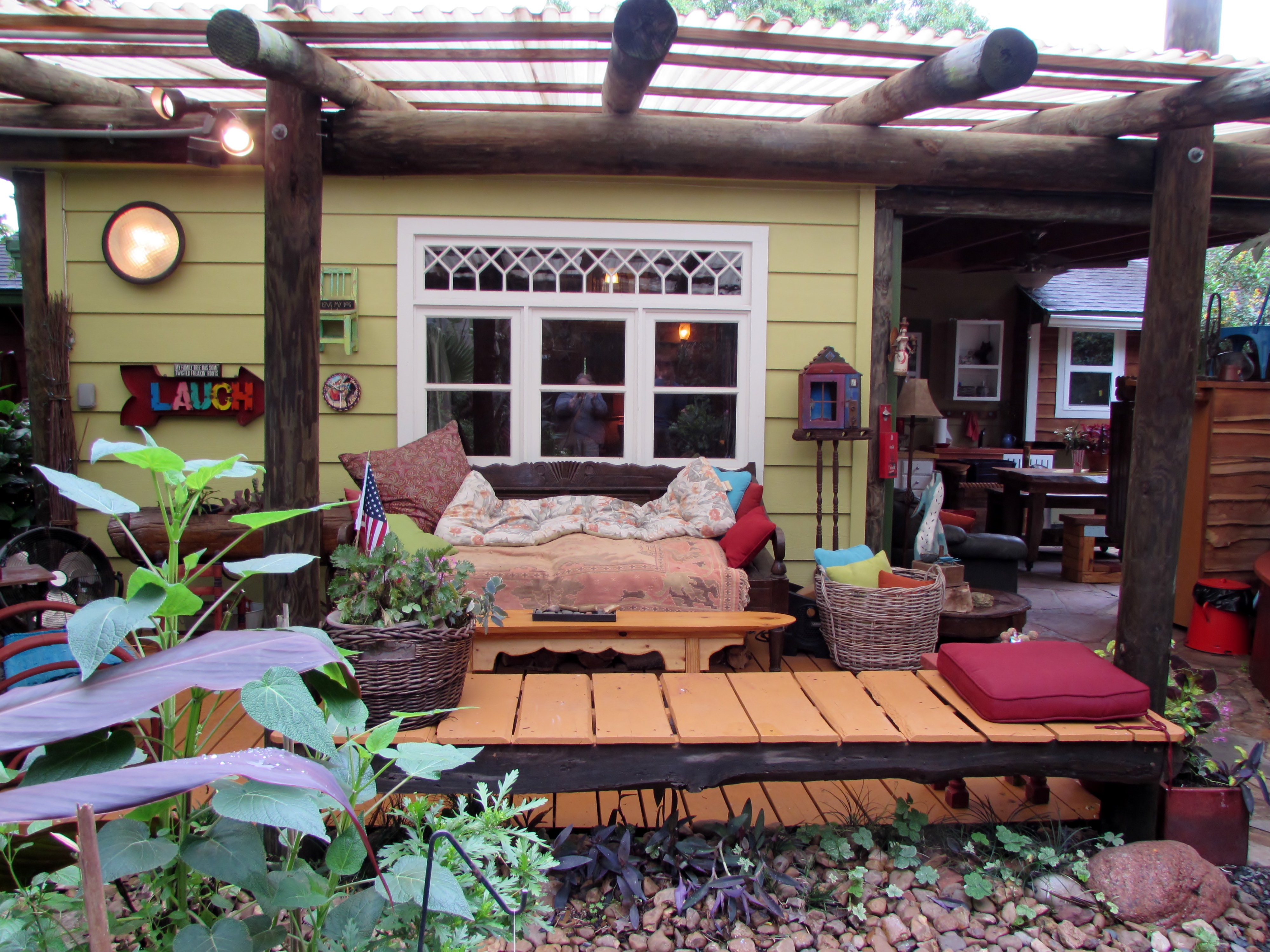 As we get to the front porch we find just to our left one of many sitting areas. What a great place to sit and chat with neighbors. As well as being an artist Jeff is a skilled carpenter and makes his own furniture out of reclaimed and hard woods. He brings this talent to his customers when he does their landscaping. Between living life, traveling and doing his art Jeff is a landscape artist, designer and installer. He owns Kabloom Landscaping.