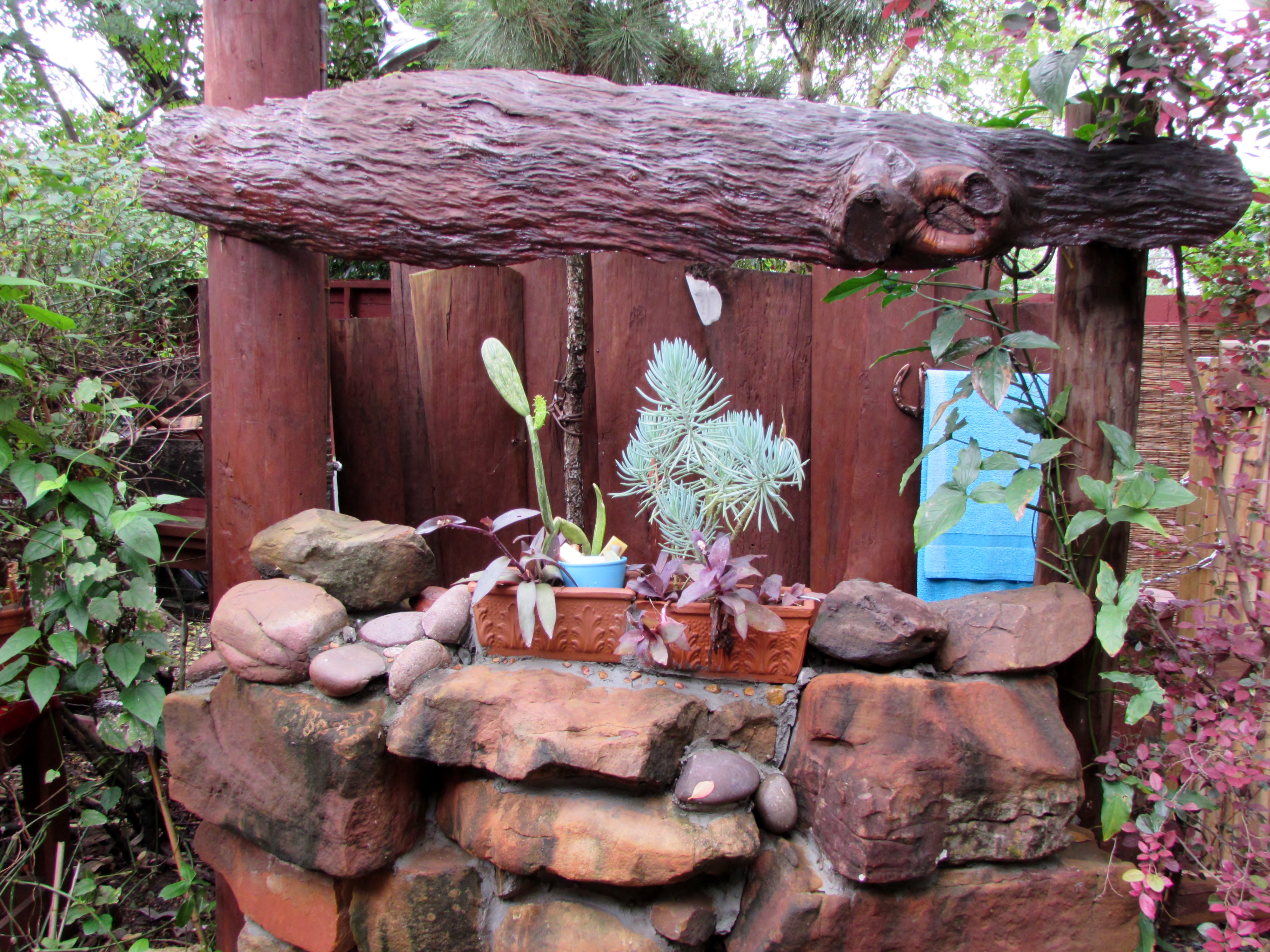 You can see this from the garden room but it is still private enough! When I lived in San Diego my father-in-law had an outdoor shower behind a huge Wax myrtle bush. On a hot dry day it was the perfect place to wash the dirt off. This garden also has an outdoor kitchen so the only things that is missing is an outdoor loo. I imagine that is against the city code.