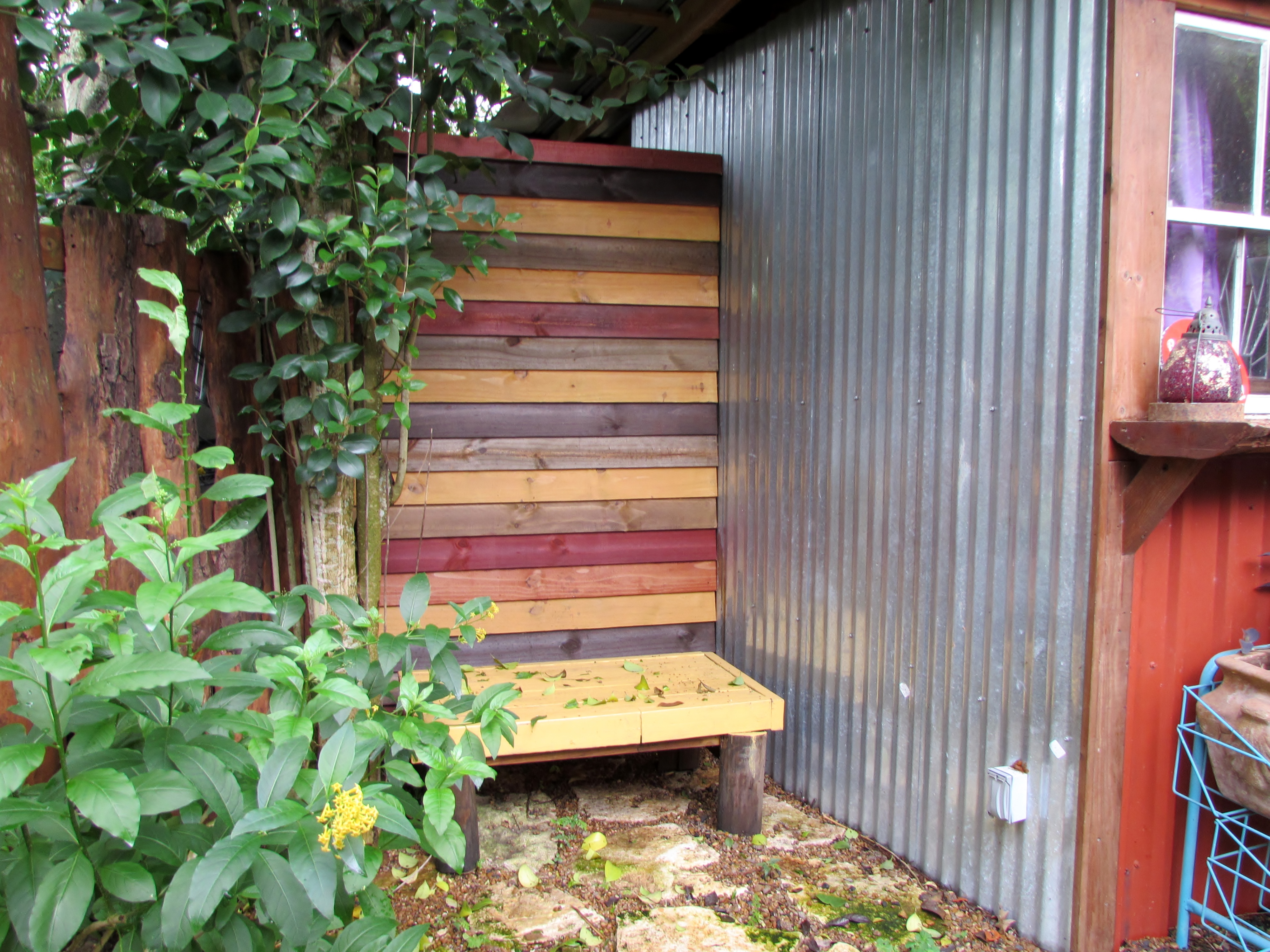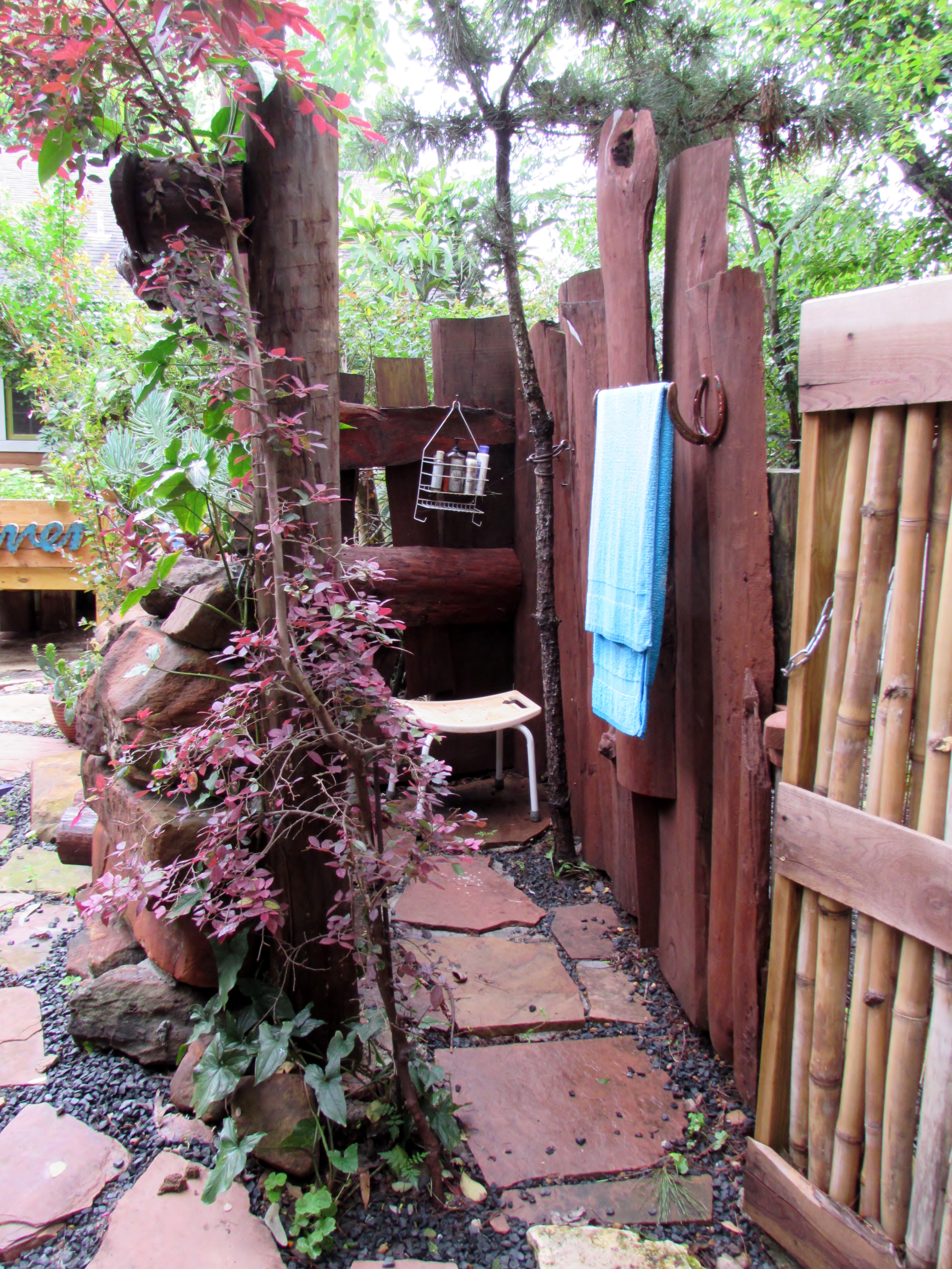 Following along the fence going west is the outdoor shower. Being an immersion gardener, like I am, I love outdoor showers. I imagine this one gets a lot of use.