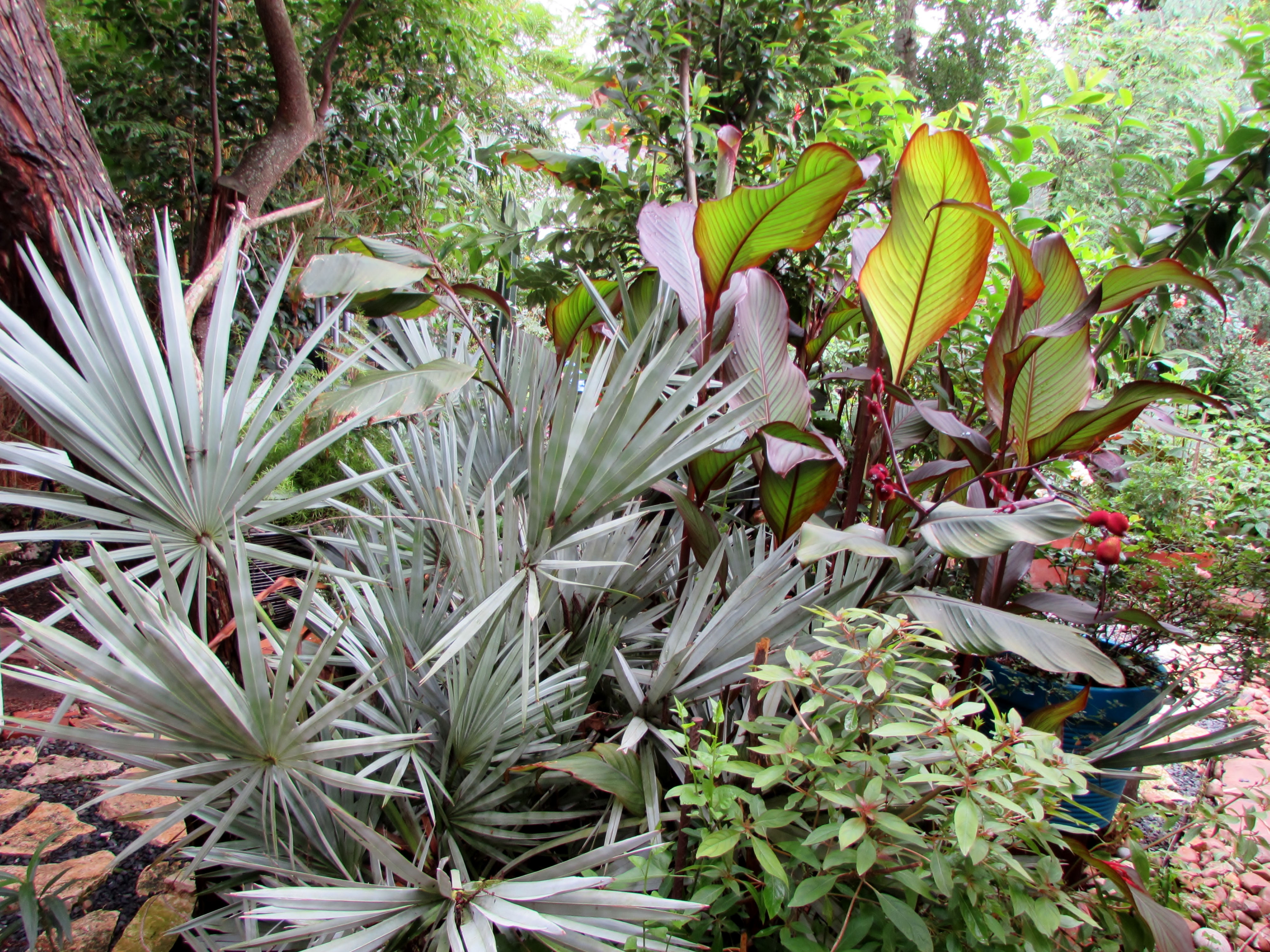 Around the corner from the shed is a private nook, with another metal glider in blueberry this time. This is the side of the casita that Warren uses to do massage therapy. The palm and bamboo remind me of Puerto Vallarta, Mexico. An ideal petting station where you can enjoy the shade with the menagerie of dogs that share the garden with Jeff and Warren.