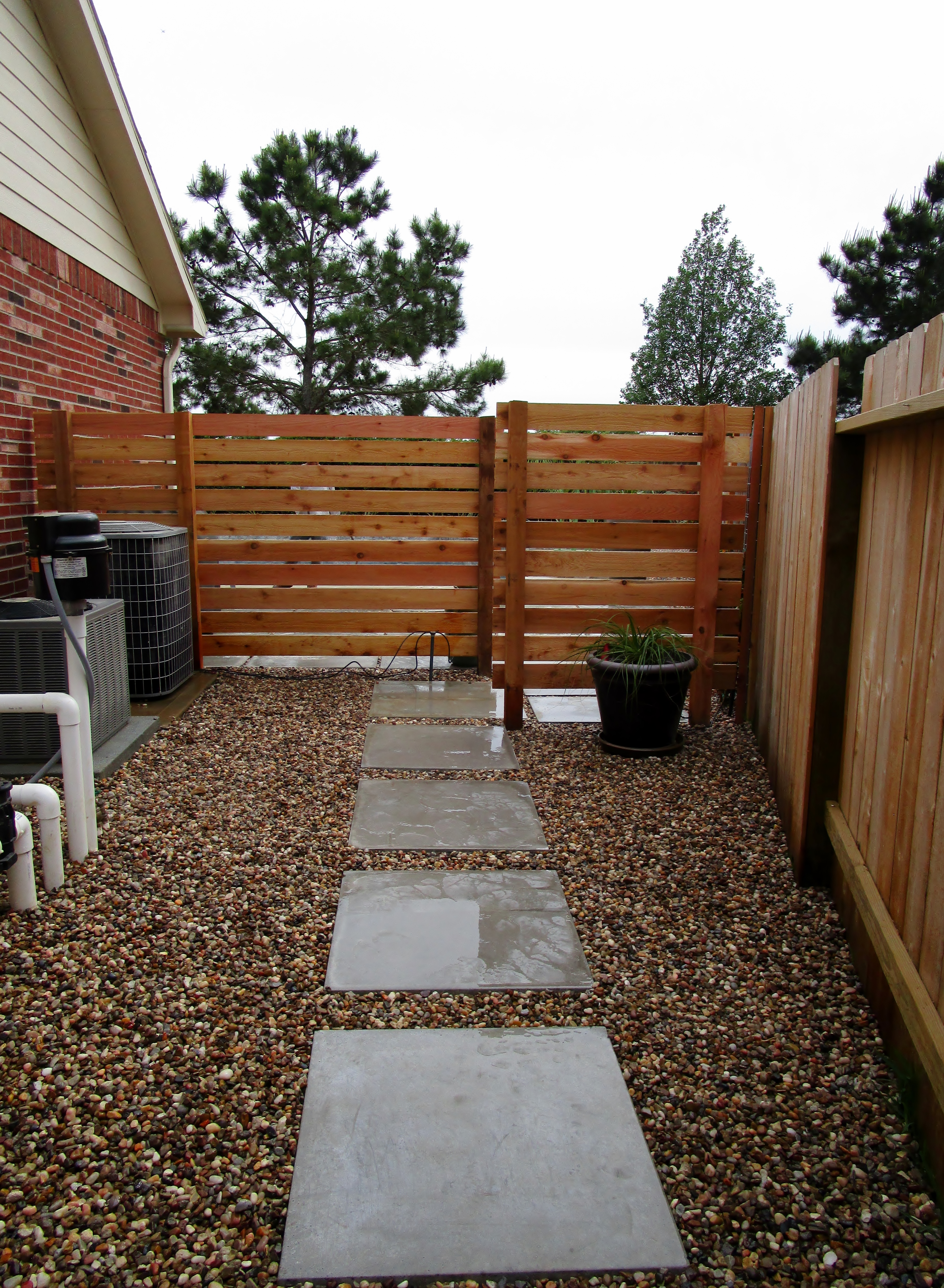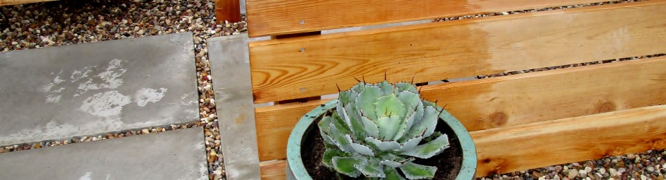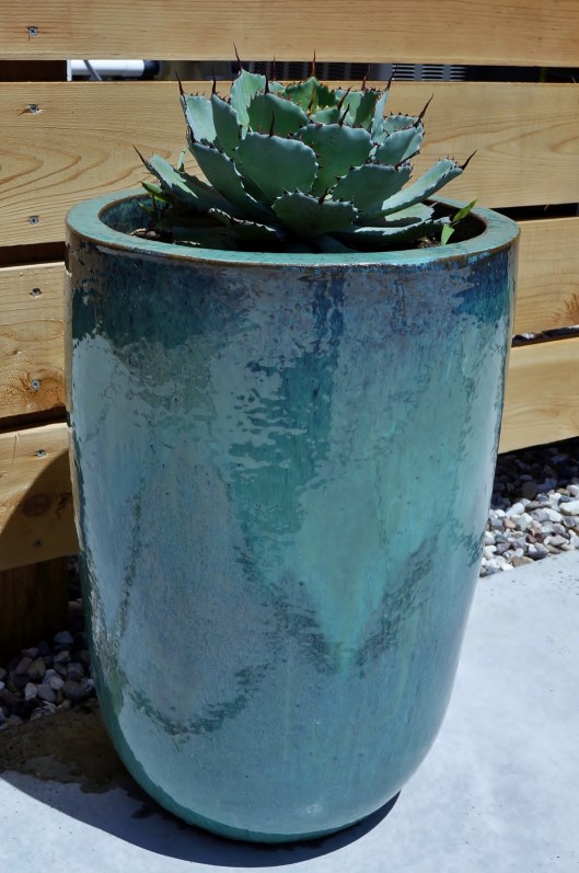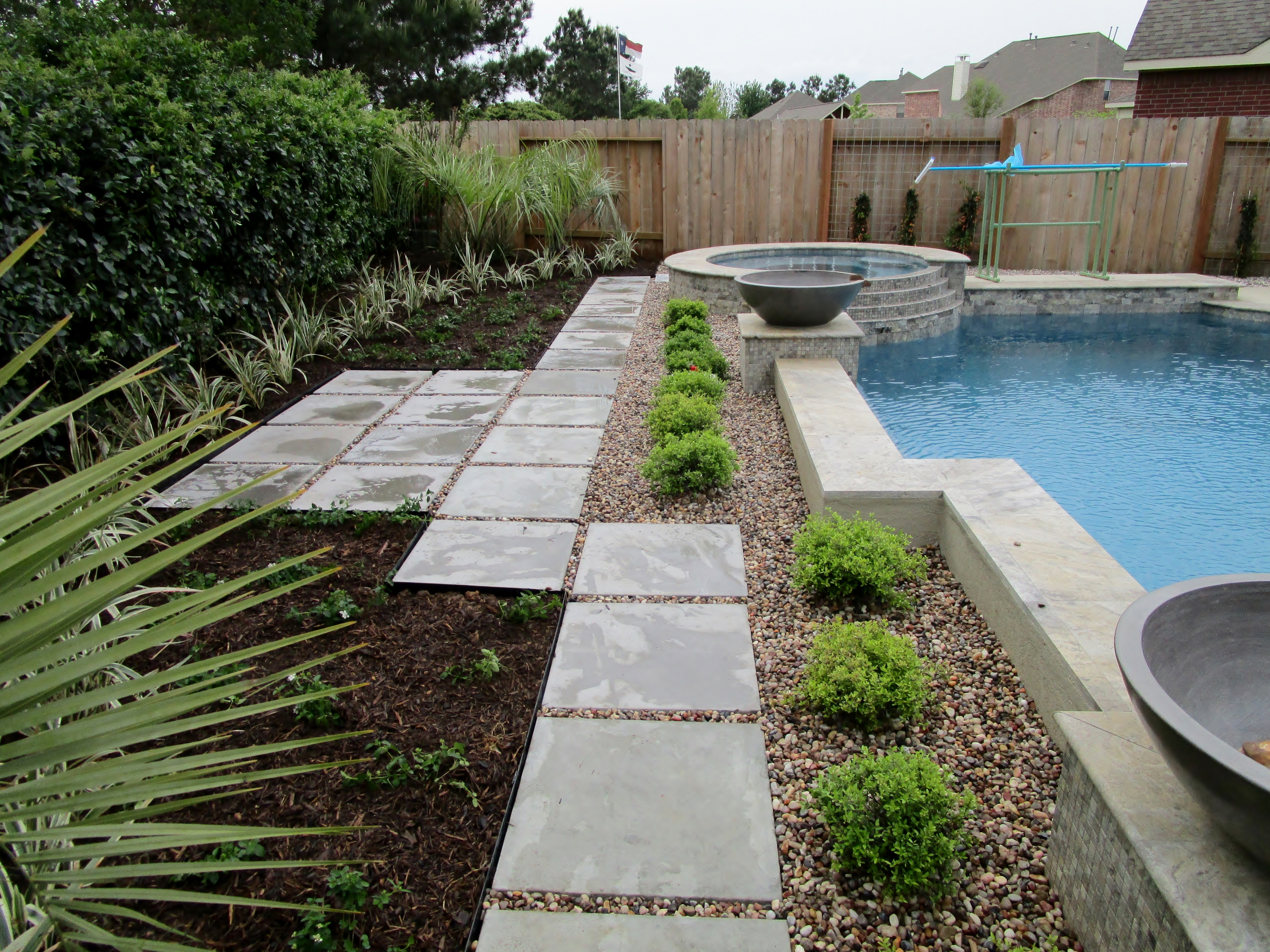 Just a few weeks back we finished a landscaping project, for my daughter Amber and her family, around the pool they had installed late winter 2015. They had strong ideas of what they wanted and talked to several pool companies before going with Cypress Custom Pools. This is a pool that had to fit carefully into the space between the house and the utility easement to the south as well as staying off the property line to the west. poolscape in Fairfield We kept up with the pool install via pictures messaged to us by my daughter. They are very pleased with how the pool turned out. We worked on a landscape design that would work with all the materials they used in the pool. We wanted the hardscape and plantings to be a complement to the pool which is the real jewel and focus.Poolscape in Fairfield by Ravenscourt Landscaping & Design LLCOur part, the landscaping, is the background and frame. We started with a blank slate except the hedge of ligustrum. It helps block the noise from the street and middle school so needed to stay.Before landscapingWe worked to maximize the spaces around the pool by adding a patio in the angular side yard. Amber wanted to use travertine tile to match the stone in the pool but it was not in the budget. We suggested using the cement pad with rainbow gravel to make a nice looking and very functional solid patio. This was less expensive than many other options we discussed. In addition it is also water permeable. cement pad patio We used 1-36″x36″, 5-30″x30″, 24-25″x36″ and 30- 24″x36″ concrete pads so 60 in this install. That meant we really needed to have them delivered. cement pad delivery They had recently moved the fence and gate back to have room for the pool equipment. We talked through how to create a screen to hide it using plants or wood. I thought another fence with a gate but they didn’t want to have to go through two gates. Then Shawn suggested an off-set screens to mask both the a/c and the pool equipment.Cedar Screen to hide pool equipmentFrom most angles the A/C and pool equipment is hidden yet easy to access. It also creates a place to store pool toys, etc. Cedar screen to hide pool equipment Here is Emma trying out the new path and checking up on the details. Cedar Screen to hide pool equipment You see you have to be at just the right angle to see what is behind. Cedar Screen hiding A/CWe created a path matching the patio behind the pool in the utility easement to add another way to get to the hot tub and even ended up with room for another little sitting area that gets more shade. The plants are all hardy and drought and frost tolerant. They also will need minimal trimming. We used drip tubing to water the beds because it is so much more efficient and waters the whole bed more evenly (they are even under the gravel at the dwarf yaupon hedge).cement pad path View from the opposite direction after the mulch was installed. I am not a big fan of looking at mulch but to save money we used one gallon plants. I am hoping that the lantana will fill in quickly to eliminate the need to weed and even become their own ground cover. after the mulch Here is the little patio that gets more shade than on the other side of the pool. It could hold a cafe table and two chairs or a bench. Perhaps it is a good place for a hammock. small cement pad patioPlant deliveryMy daughter and her husband both grew up in Southern California. They enjoy modern clean lines. They were pleased with the modern Mediterranean beach look I came up with for them.  This area used to be lawn but after the pool was constructed it was just dirt/mud. Instead of putting back lawn, which they still have plenty of,  I decided on big beds and fun plants. We used 3 Pindo palms, a field of white lantana, and a row of Dianella which will make a nice contrast with its variegated sword shaped leaves against the dark green ligustrum hedge along the back fence. I have read that lantana repels mosquitoes. That would be nice!poolscape in Fairfield Landscaping around a poolThe Pindo palms will only get about 12-15′ tall and are very hardy. I wanted something that stayed in your field of vision as they are really the featured plant. When my grandson Justin saw them he told his Mom that they are his favorite trees. Can’t say I planned that but it makes me smile. Amber wanted a small hedge behind the pool to hide the piping. We used Dwarf Yaupon holly. This gives a break of green between the pool and the path and already hides the plumbing, that otherwise would be quite obvious. The path leads all the way to the hot tub which makes it accessible from both directions. cement path to hot tubPottery from Joshua's Native PlantsI had fun helping my daughter pick out pottery and plants for the new patio. We found it all locally at Joshua’s Native Plants. They import them straight from Vietnam. We placed these two pots here to help mask some of the plumbing. The tall one has a Bird of Paradises and the smaller a Color Guard yucca: one of my favorite plants. Both are heat loving and can take the afternoon sun. The 3rd pot in this set of 3 sports an Agave Kissho Kan. Agave sp. Kichiokan. According to Plant Delights, this is a Japanese selection that they believe came from a Mexican hybrid that was circulated by collectors under several spellings. Kissho Kan means “happy (lucky) crown”, in Japanese.  For more info click HERE. I like the way the colors of the plant and pot go together.