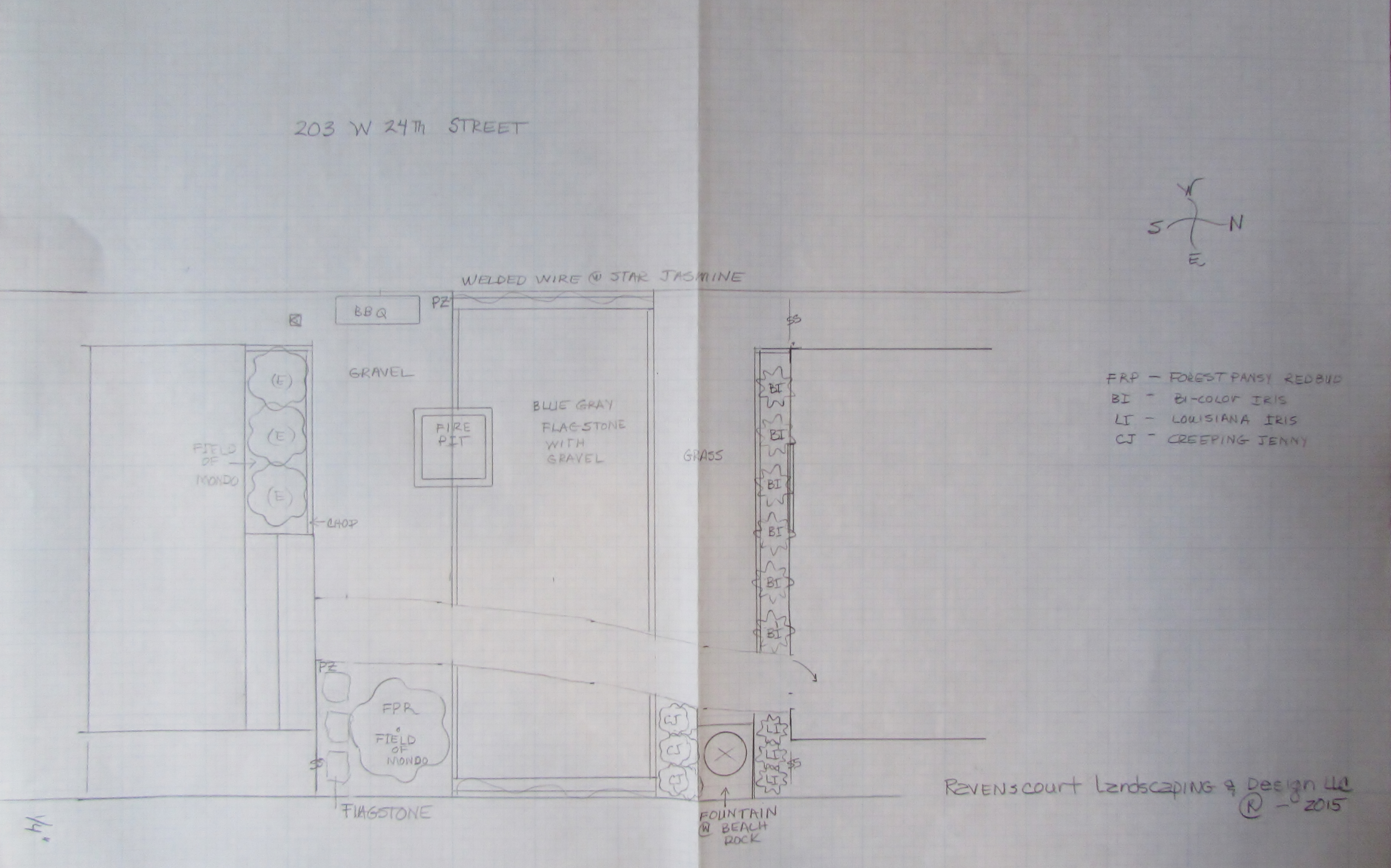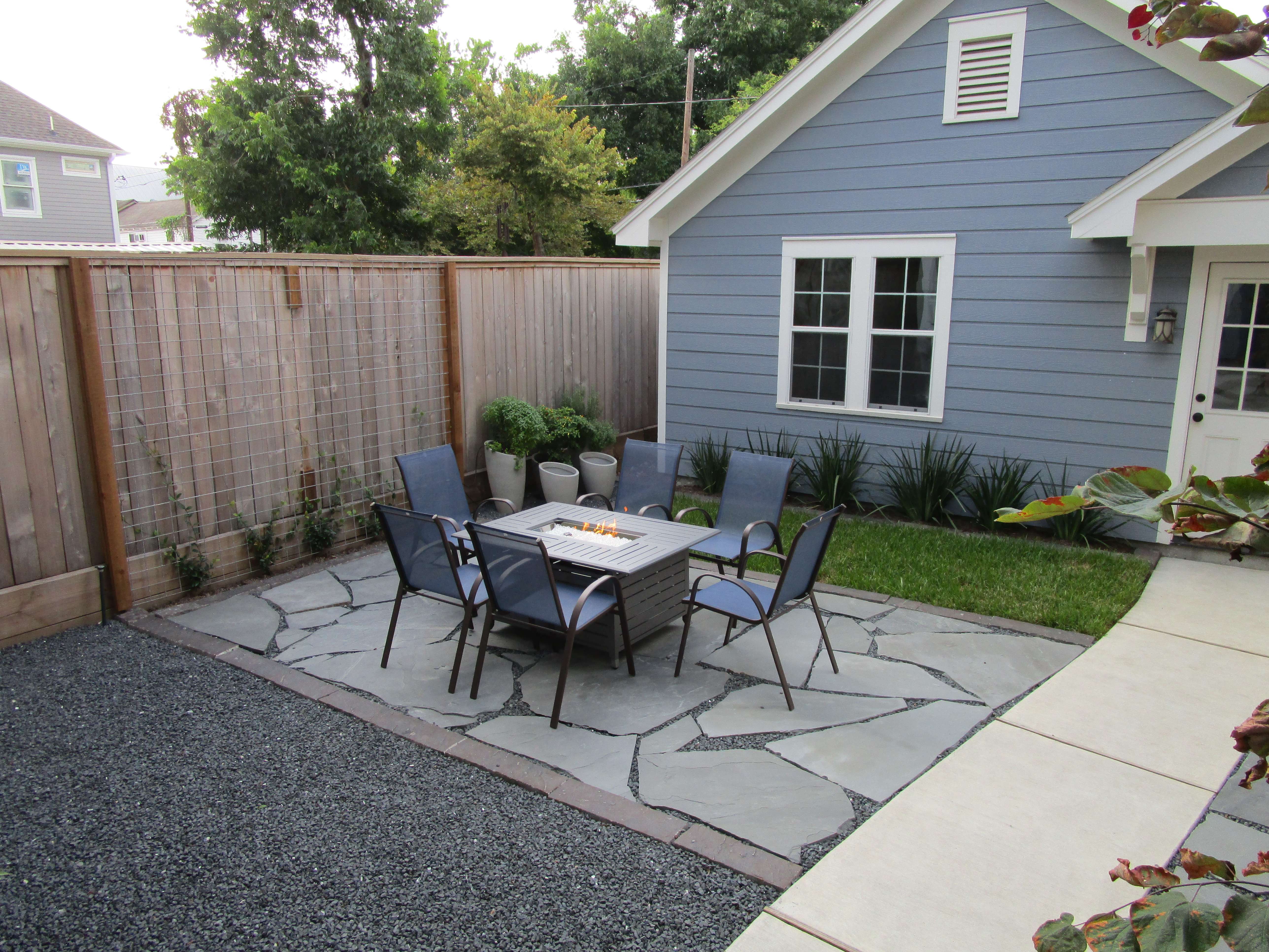 Above in the lower left corner is where I planned a place for a fountain. The couple decided against it at this point. We can always add one at later date. Below you see a big swath of gravel. It has several functions. It is the path to the side of the house and it is room to spread out in a large gathering as well as helps divert excess rainfall, unobtrusively, to a nearby drainbox. If you check the design I had a fire pit half in the patio, half in the gravel. They opted for a movable one. And that changed when they actually found a very cool fire dining table.