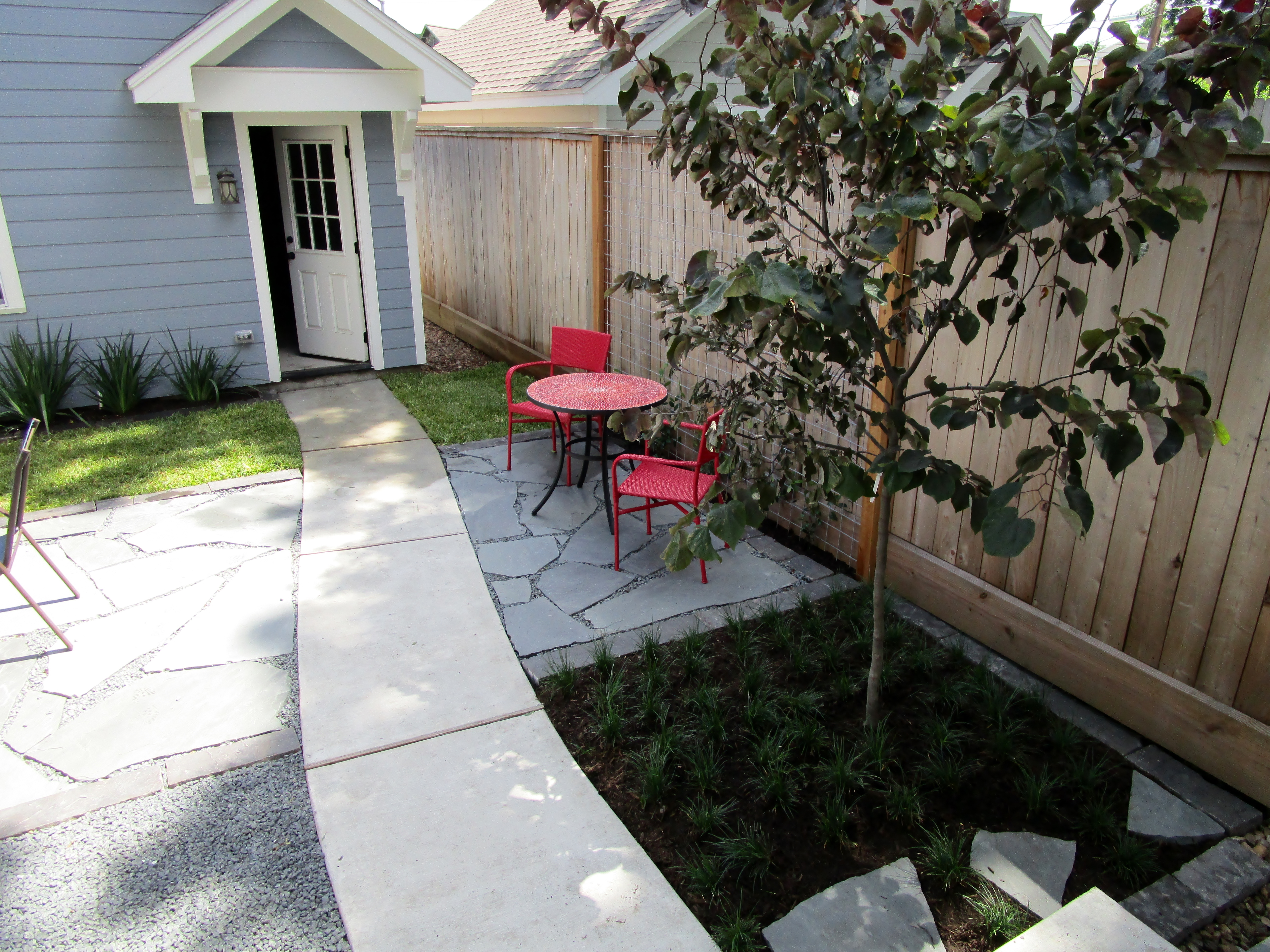 On the little space to the right of the curved walk I suggested a little cafe table and chairs. A nice place for a private conversation or a bit of morning shade. I love the red set they chose! The tree in the foreground is a Forest Pansy Redbud. They are wonderful for year round interest and light and airy enough not to overwhelm the space.