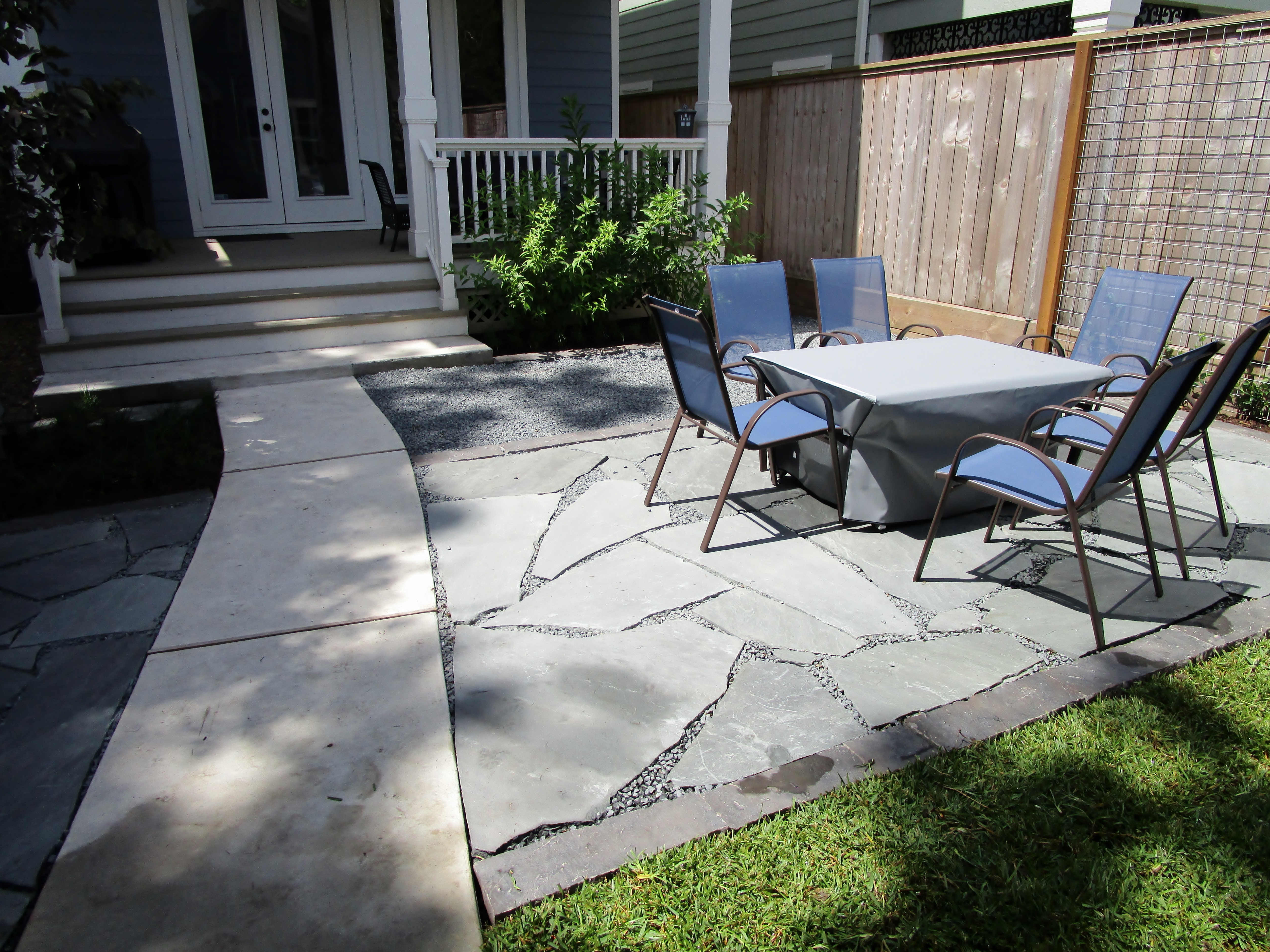 As you can see the lawn isn’t doing very well in the shade of the house. The desire was for modern clean lines that also went with the cottage look of the home. I decided to put a patio out away from the porch and flank it with green walls. I usually think of man made pavers or cement pads for a modern look. But, I didn’t like the idea of a curving path through very straight material. So I decided to use flagstone in a cool gray blue.