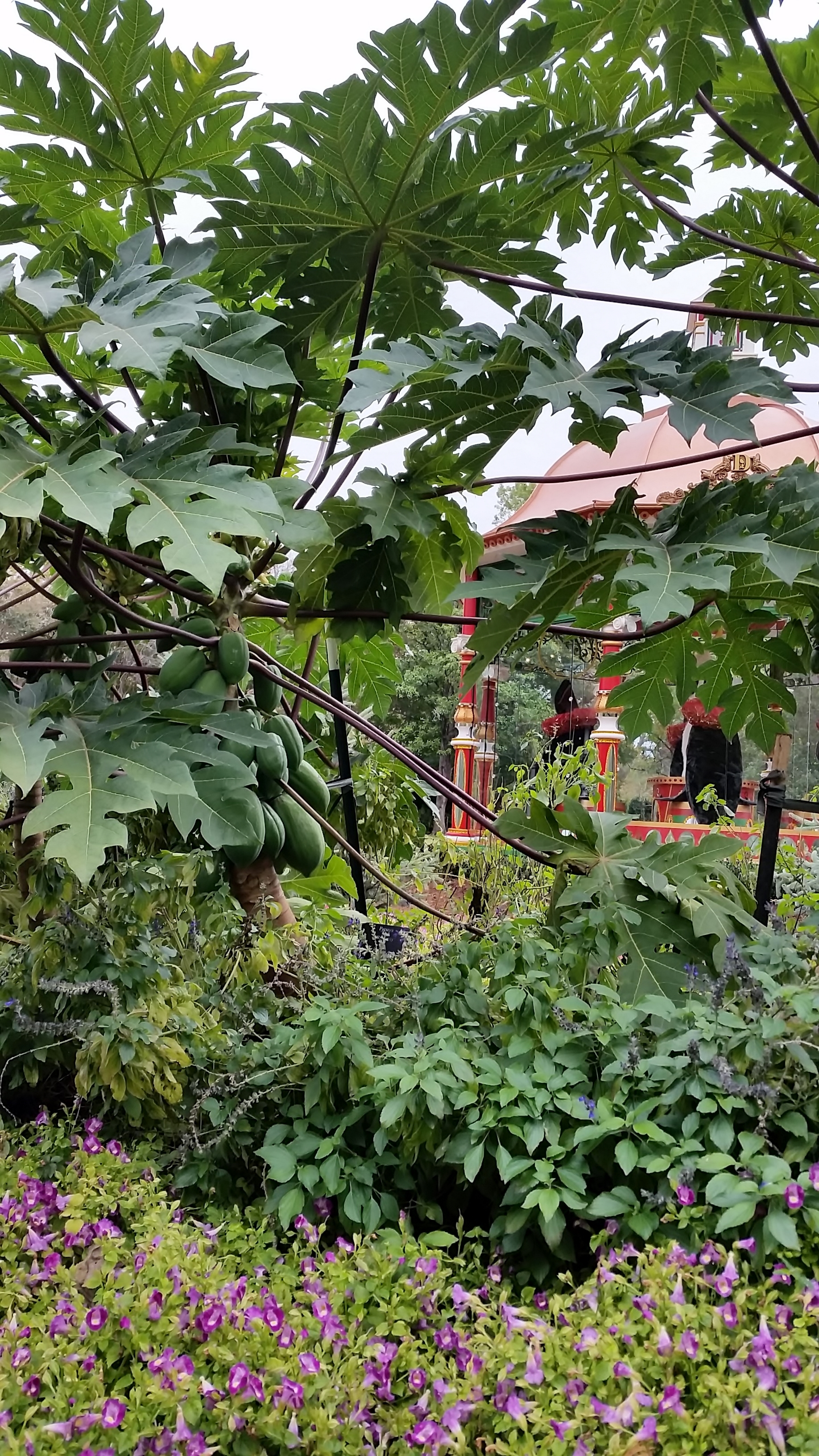 I enjoyed the contrast of the large papaya tree with the winter scene in the gazebo in the background.