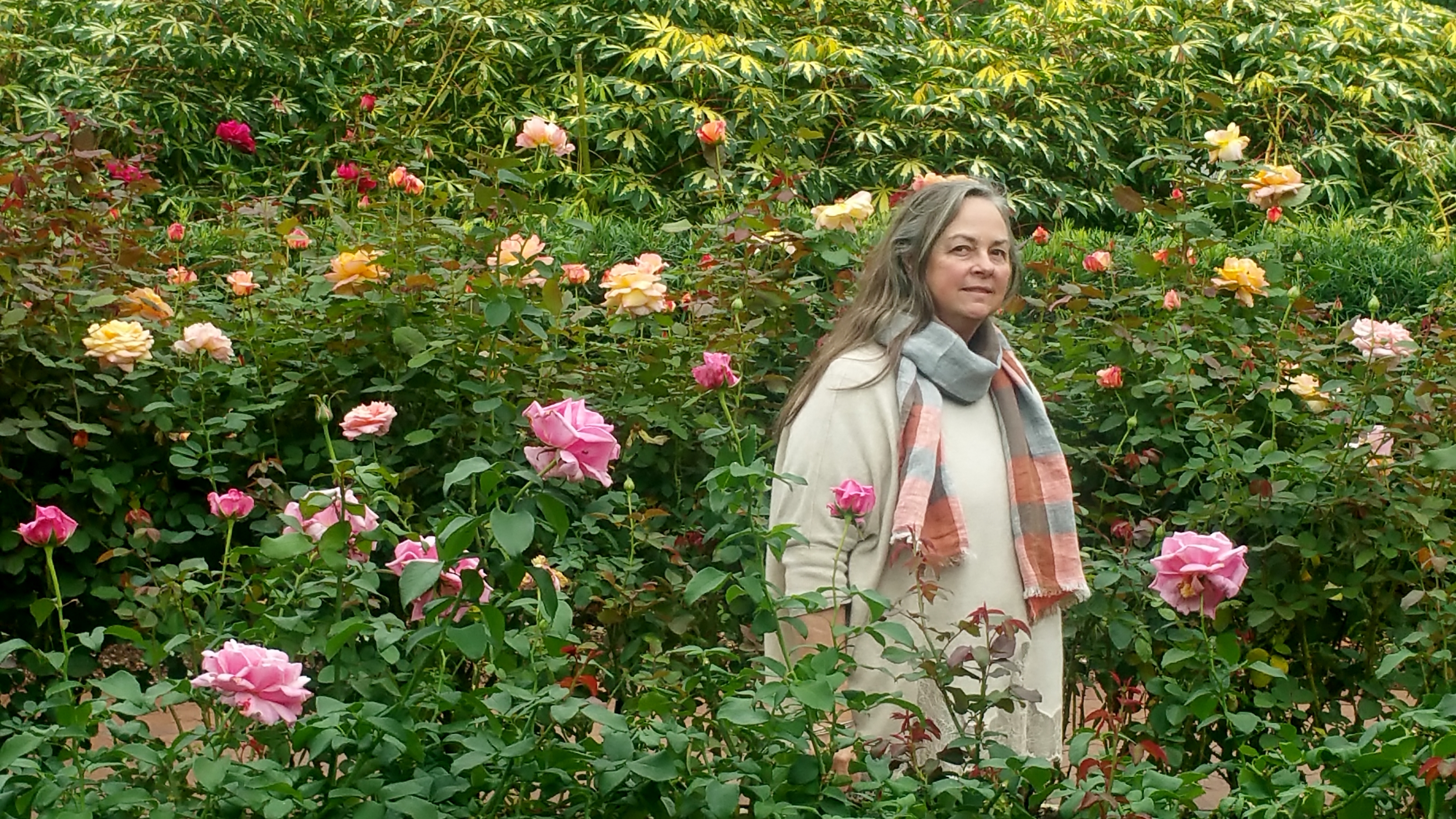 And here is Shawn’s picture of me in the rose garden. I couldn’t believe all the roses in bloom and the beautiful full Variegated Tapioca ‘Variegata’,Manihot esculenta in the background. They had grown so quickly that many of them were tressed to stand up.