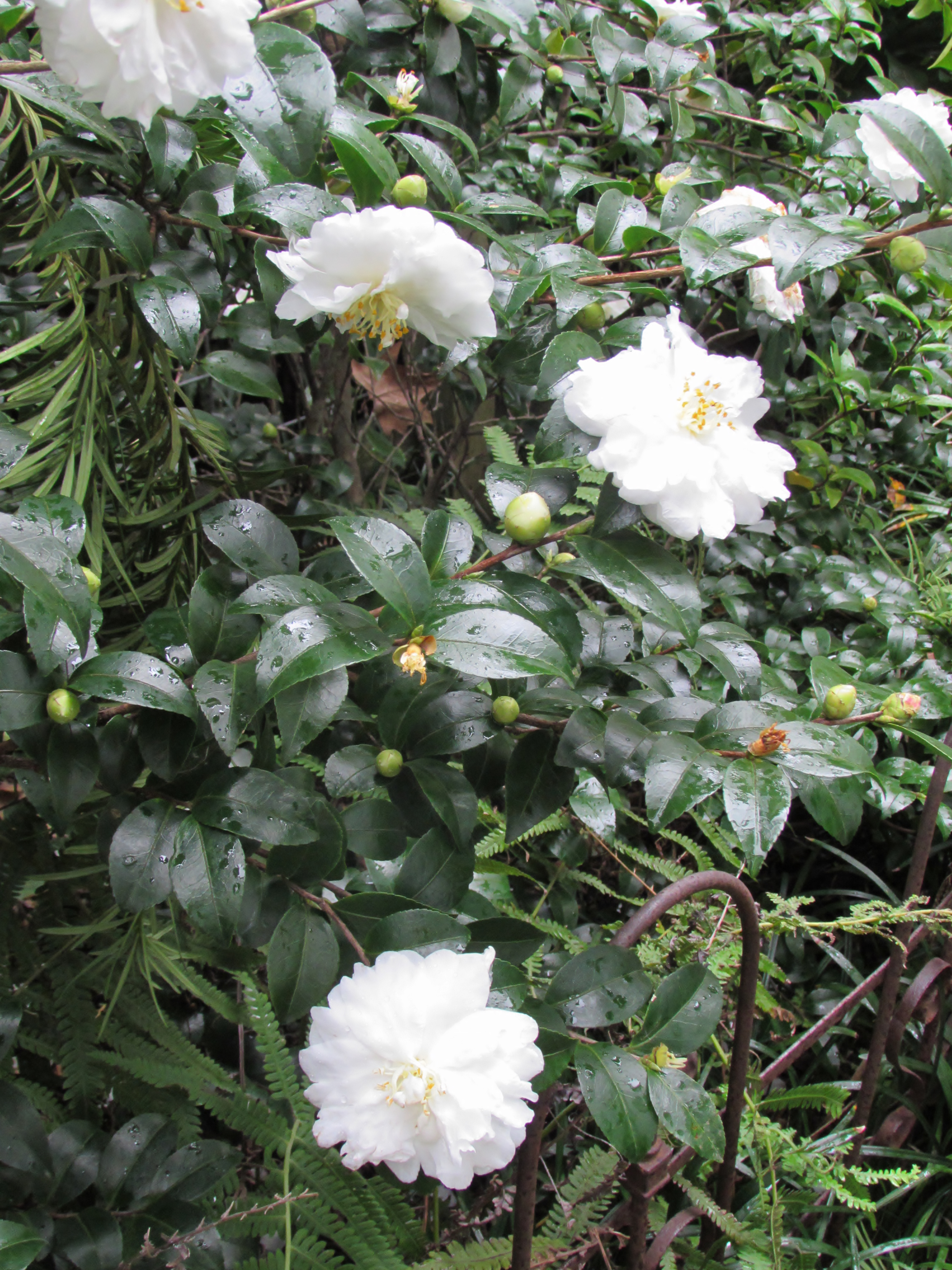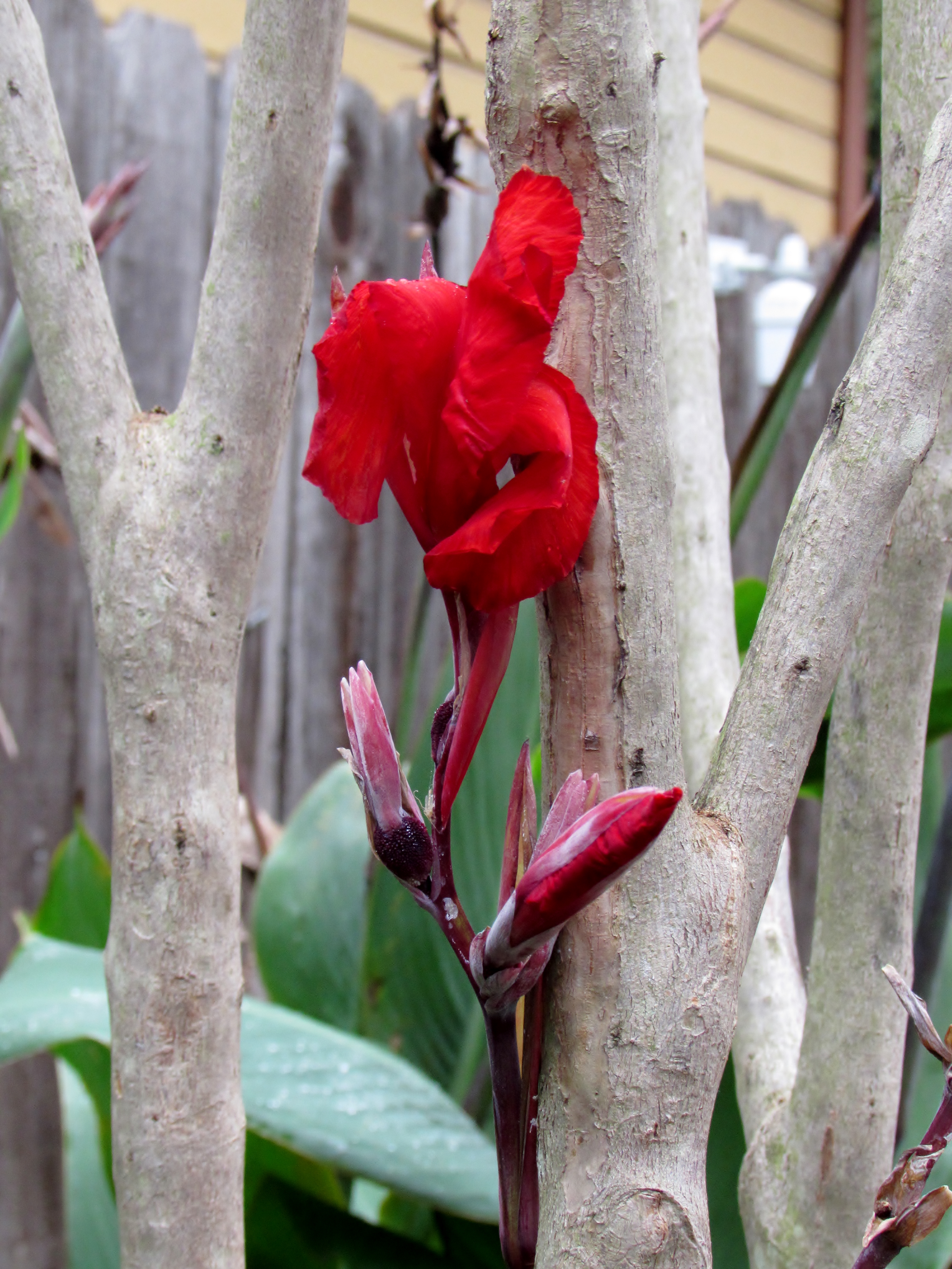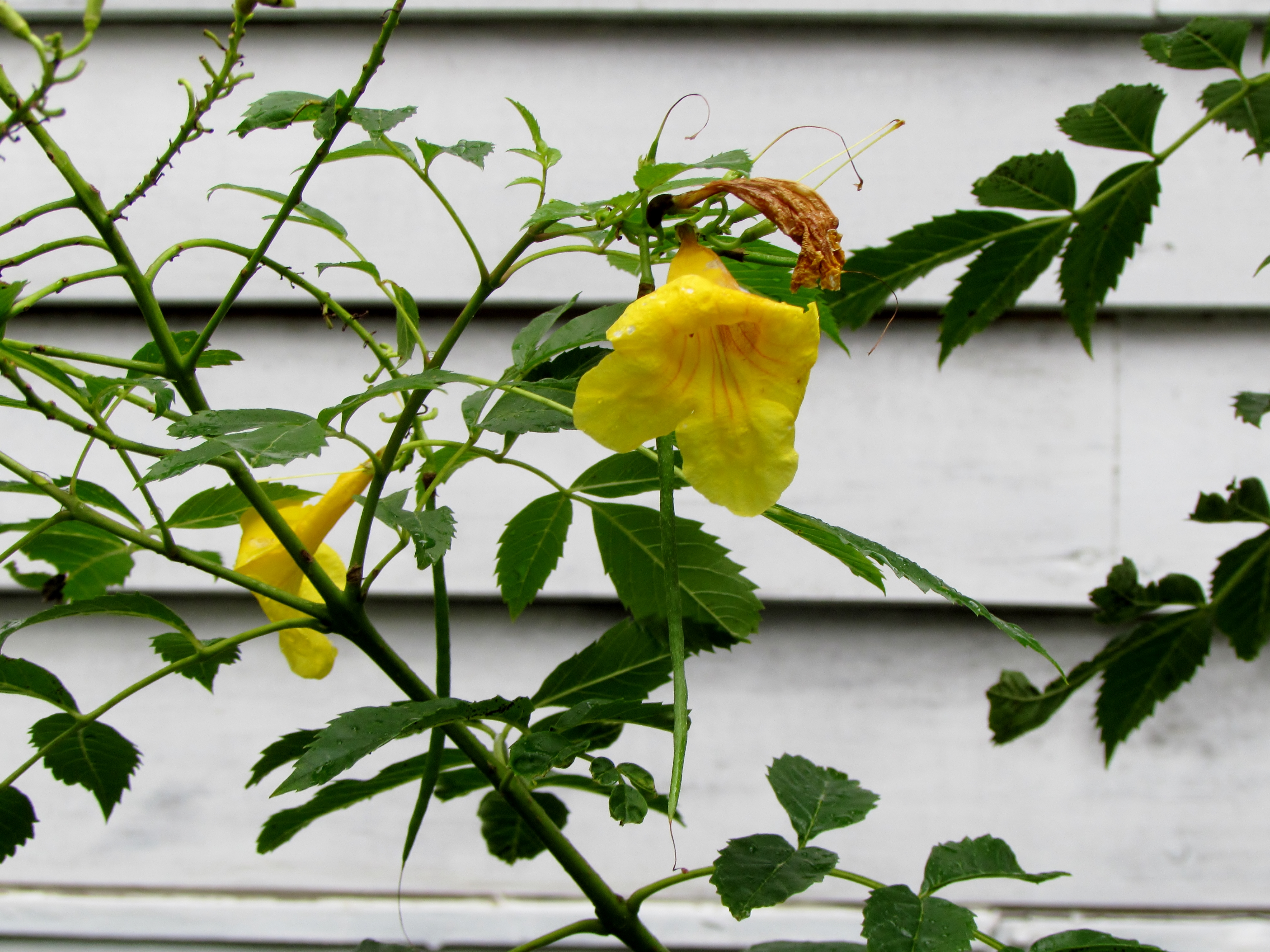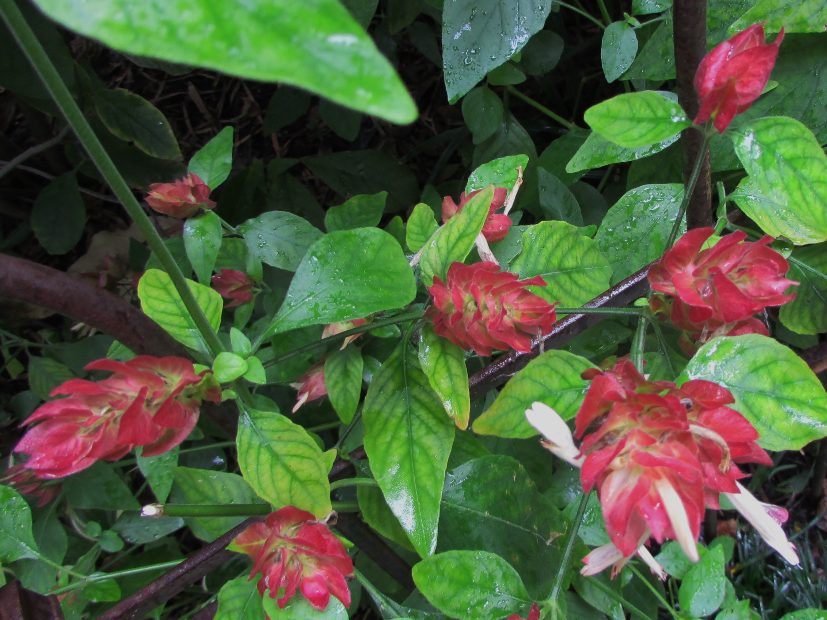 I will start in the back garden catching the last few blooms on the Esperanza Yellow Bell that we recently planted near the back door. Esperanza Yellow Bell Heading to the south side of the house hoping to catch the Blue Sky Thumbergia that is finally blooming. Sadly there were more blooms on the ground than on the vine.Blue Sky Thumbergia As you can see it had been raining off and on since dawn. We first saw a variety of Thumbergia in Puerto Vallarta growing on trellises with very thick trunks. Here it freezes back most winters but it manages to come back and cover the arch by the end of summer. Blue Sky Thumbergia Here are a few flowers that were still on the vine. But probably not now : (Blue Sky Thumbergia The Yule Tide camellia had a bloom earlier in the month but not now. Should be more in December. The White camellias, Camellia sasanqua ‘White Doves’ (‘Mine-No-Yuki’) ,are blooming. It is my favorite plants in our garden. I would love to use it in designs but can’t find a source for them anymore. They are the perfect size for smaller beds. I find the Sasanqua do much better in Houston than Japonicas. White Doves Camellia Camellia sasanqua 'White Doves' ('Mine-No-Yuki')As I was taking the picture I noticed a little insect having a feast. It looks like an ant to me but not really sure. White Doves Camellia Camellia sasanqua 'White Doves' ('Mine-No-Yuki')The Shrimp plant is full of flowers. It can be a bit invasive and we cut it back hard last year. It seems to be happy and came back quickly. Shrimp plantThe last plant on this side garden is also a new one for us. Thryallis, Golden Thryallis, Galphimia gracilis. Interesting that we added two plants with yellow flowers. We had to take out a Loropetalum in order to plant two thryallis. It was just time for a change. I can see both the Shrimp plant and the Thryallis out my window were my computer is located. Thryallis, Golden Thryallis Galphimia gracilisThis is my view from our office where my design work table is located. You can see the camellias are getting a good rinse. In the foreground are the Miniata salvia. I find their red flowers very hard to photograph. Looking our our office window. Heading to the back yard, bypassing the holding area, I noticed the orange mums we saved from a rip-out and stuck in the end of the raised herb and veggie bed. They come back every year and make for a bright spot in the sea of green. Orange MumsToday it was hard to get my camera to focus because the darkening clouds were blocking the sunlight. While at the Dallas Arboretum over the weekend we noticed all their Sweet Olive, Fragrant Tea Olive, Osmanthus fragrans were blooming. I made a note to check on ours and sure enough little cream flowers and a lovely sweet scent. Sweet Olive, Fragrant Tea Olive Osmanthus fragransWe have a hedge of 4 that were left over from a past job. They have been in the ground about 5 years and are now taller than the fence. I think they make a nice privacy screen if you are patient enough to let them grow in.  Next to them is Canna Row. It took a big hit last year with a hard freeze. These lovely red ones are putting on a show right now. Red CannaI think I caught them just in time before the hard rain takes its toll. This one was looking rather sexy cuddling up to a Crape myrtle that is waiting to be planted in our next install. Red CannaHeading out to the front garden we have a few things still blooming. This is a volunteer Turks Cap probably planted by the birds. It is using the climbing rose as a trellis. Turks CapI had to share these little Mexican Mint Marigolds that have sprouted up a few feet away from where we originally planted them. Mexican Mint Marigold The flowers on the Variegated Jewels of Opar, Fame Flower ‘Variegatum’,Talinum paniculatum are very hard to see and even harder to photograph. This plant froze to the ground last winter but seems to be root hardy. I love the leaves!Variegated Jewels of Opar, Fame Flower 'Variegatum' Talinum paniculatumAround on the north side of the house, in the shade garden, there is very little in bloom. I did find several flowers on the Red firespike that grows behind the row of Japanese yews.Red Firespike Here is a closer look at the little tubular flowers.Red Firespike The Matchstick bromeliads in the back corner of this garden are putting on a good show. I don’t cover much in the winter but if there is going to be a hard freeze I cover my collection of bromeliads. Matchstick BromeliadOne last photo, and not even a flower, taken a week or so ago is of our little volunteer American sycamore that is rooted into a crevice in our big rock that sits between to giant sycamores in the right of way strip. Plants are truly amazing. I can’t believe it survived the summer! Baby American Sycamore in crevice of a rock. Happy Gardening!