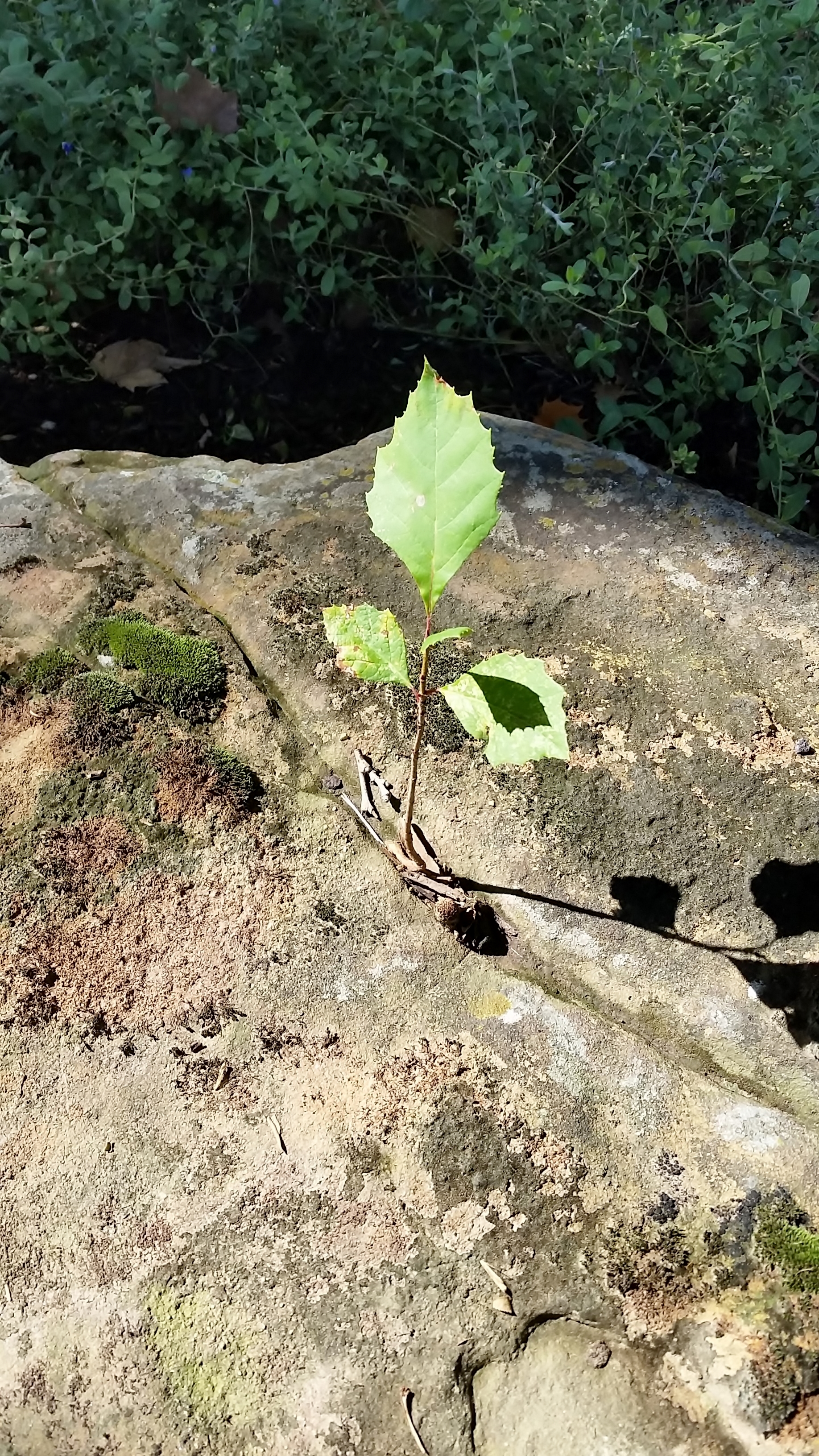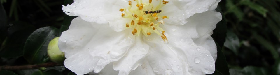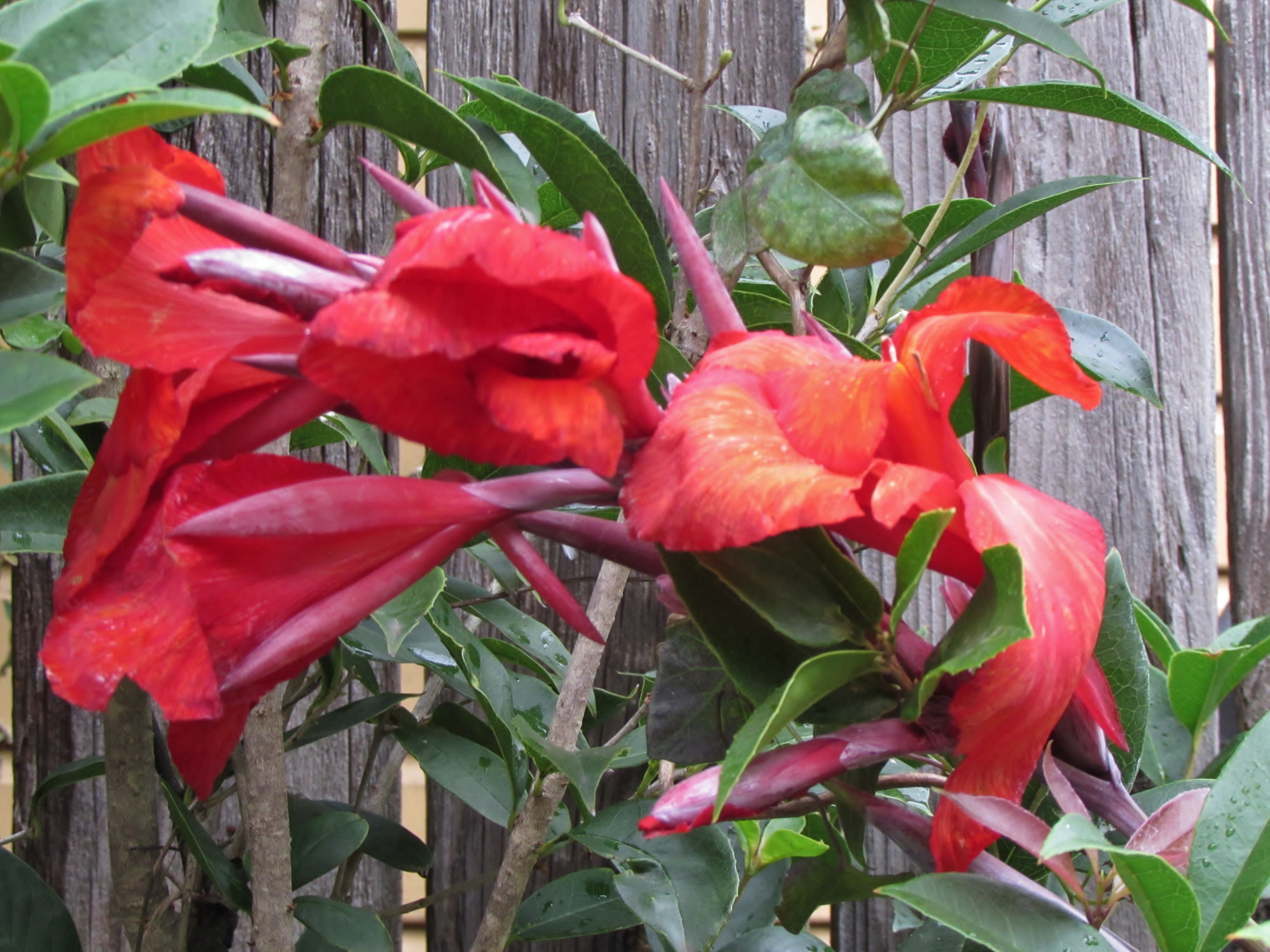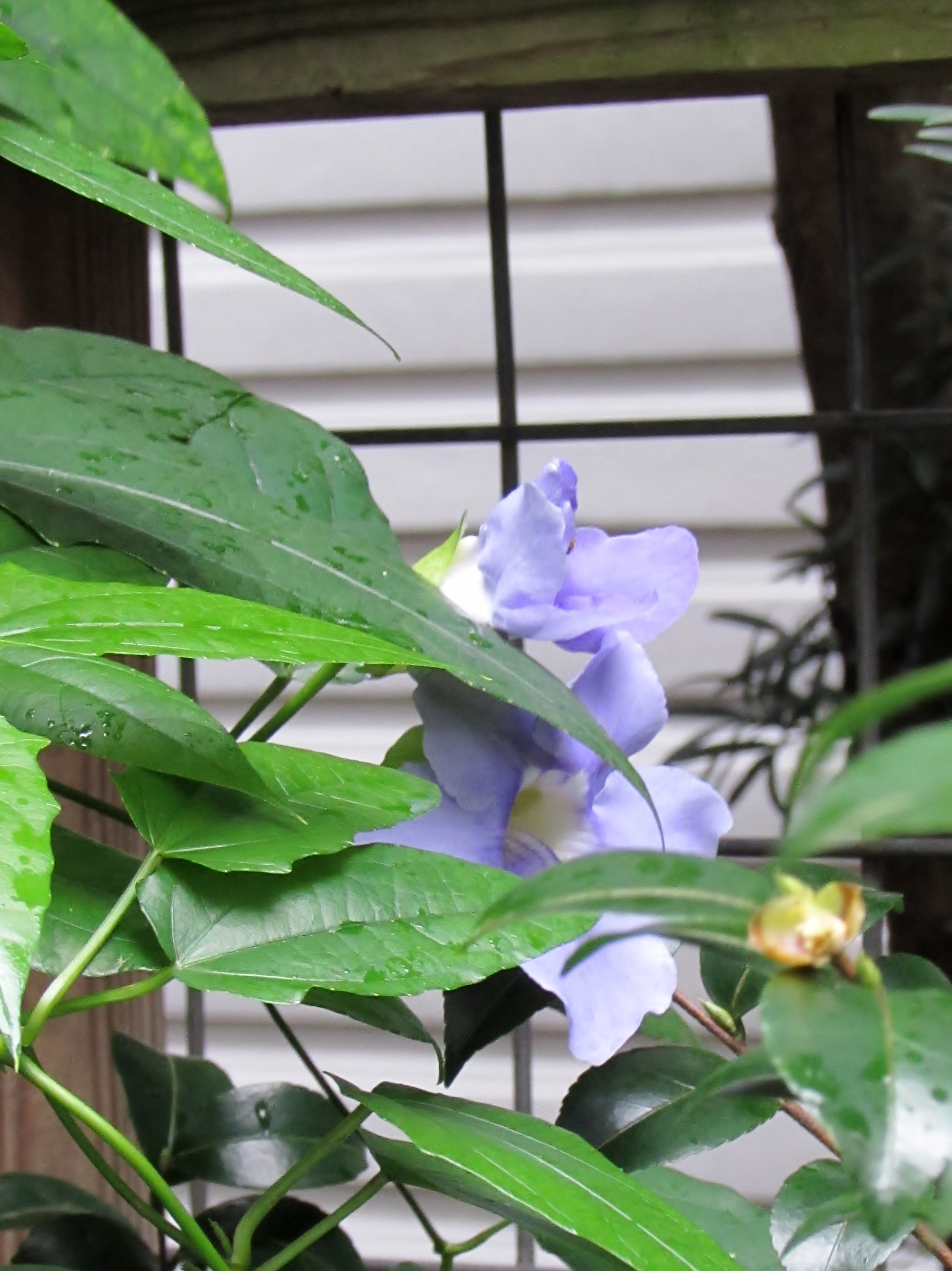 I will start in the back garden catching the last few blooms on the Esperanza Yellow Bell that we recently planted near the back door. Esperanza Yellow Bell Heading to the south side of the house hoping to catch the Blue Sky Thumbergia that is finally blooming. Sadly there were more blooms on the ground than on the vine.Blue Sky Thumbergia As you can see it had been raining off and on since dawn. We first saw a variety of Thumbergia in Puerto Vallarta growing on trellises with very thick trunks. Here it freezes back most winters but it manages to come back and cover the arch by the end of summer. Blue Sky Thumbergia Here are a few flowers that were still on the vine. But probably not now : (Blue Sky Thumbergia The Yule Tide camellia had a bloom earlier in the month but not now. Should be more in December. The White camellias, Camellia sasanqua ‘White Doves’ (‘Mine-No-Yuki’) ,are blooming. It is my favorite plants in our garden. I would love to use it in designs but can’t find a source for them anymore. They are the perfect size for smaller beds. I find the Sasanqua do much better in Houston than Japonicas. White Doves Camellia Camellia sasanqua 'White Doves' ('Mine-No-Yuki')As I was taking the picture I noticed a little insect having a feast. It looks like an ant to me but not really sure. White Doves Camellia Camellia sasanqua 'White Doves' ('Mine-No-Yuki')The Shrimp plant is full of flowers. It can be a bit invasive and we cut it back hard last year. It seems to be happy and came back quickly. Shrimp plantThe last plant on this side garden is also a new one for us. Thryallis, Golden Thryallis, Galphimia gracilis. Interesting that we added two plants with yellow flowers. We had to take out a Loropetalum in order to plant two thryallis. It was just time for a change. I can see both the Shrimp plant and the Thryallis out my window were my computer is located. Thryallis, Golden Thryallis Galphimia gracilisThis is my view from our office where my design work table is located. You can see the camellias are getting a good rinse. In the foreground are the Miniata salvia. I find their red flowers very hard to photograph. Looking our our office window. Heading to the back yard, bypassing the holding area, I noticed the orange mums we saved from a rip-out and stuck in the end of the raised herb and veggie bed. They come back every year and make for a bright spot in the sea of green. Orange MumsToday it was hard to get my camera to focus because the darkening clouds were blocking the sunlight. While at the Dallas Arboretum over the weekend we noticed all their Sweet Olive, Fragrant Tea Olive, Osmanthus fragrans were blooming. I made a note to check on ours and sure enough little cream flowers and a lovely sweet scent. Sweet Olive, Fragrant Tea Olive Osmanthus fragransWe have a hedge of 4 that were left over from a past job. They have been in the ground about 5 years and are now taller than the fence. I think they make a nice privacy screen if you are patient enough to let them grow in.  Next to them is Canna Row. It took a big hit last year with a hard freeze. These lovely red ones are putting on a show right now. Red CannaI think I caught them just in time before the hard rain takes its toll. This one was looking rather sexy cuddling up to a Crape myrtle that is waiting to be planted in our next install. Red CannaHeading out to the front garden we have a few things still blooming. This is a volunteer Turks Cap probably planted by the birds. It is using the climbing rose as a trellis. Turks CapI had to share these little Mexican Mint Marigolds that have sprouted up a few feet away from where we originally planted them. Mexican Mint Marigold The flowers on the Variegated Jewels of Opar, Fame Flower ‘Variegatum’,Talinum paniculatum are very hard to see and even harder to photograph. This plant froze to the ground last winter but seems to be root hardy. I love the leaves!Variegated Jewels of Opar, Fame Flower 'Variegatum' Talinum paniculatumAround on the north side of the house, in the shade garden, there is very little in bloom. I did find several flowers on the Red firespike that grows behind the row of Japanese yews.Red Firespike Here is a closer look at the little tubular flowers.Red Firespike The Matchstick bromeliads in the back corner of this garden are putting on a good show. I don’t cover much in the winter but if there is going to be a hard freeze I cover my collection of bromeliads. Matchstick BromeliadOne last photo, and not even a flower, taken a week or so ago is of our little volunteer American sycamore that is rooted into a crevice in our big rock that sits between to giant sycamores in the right of way strip. Plants are truly amazing. I can’t believe it survived the summer! Baby American Sycamore in crevice of a rock. Happy Gardening!
