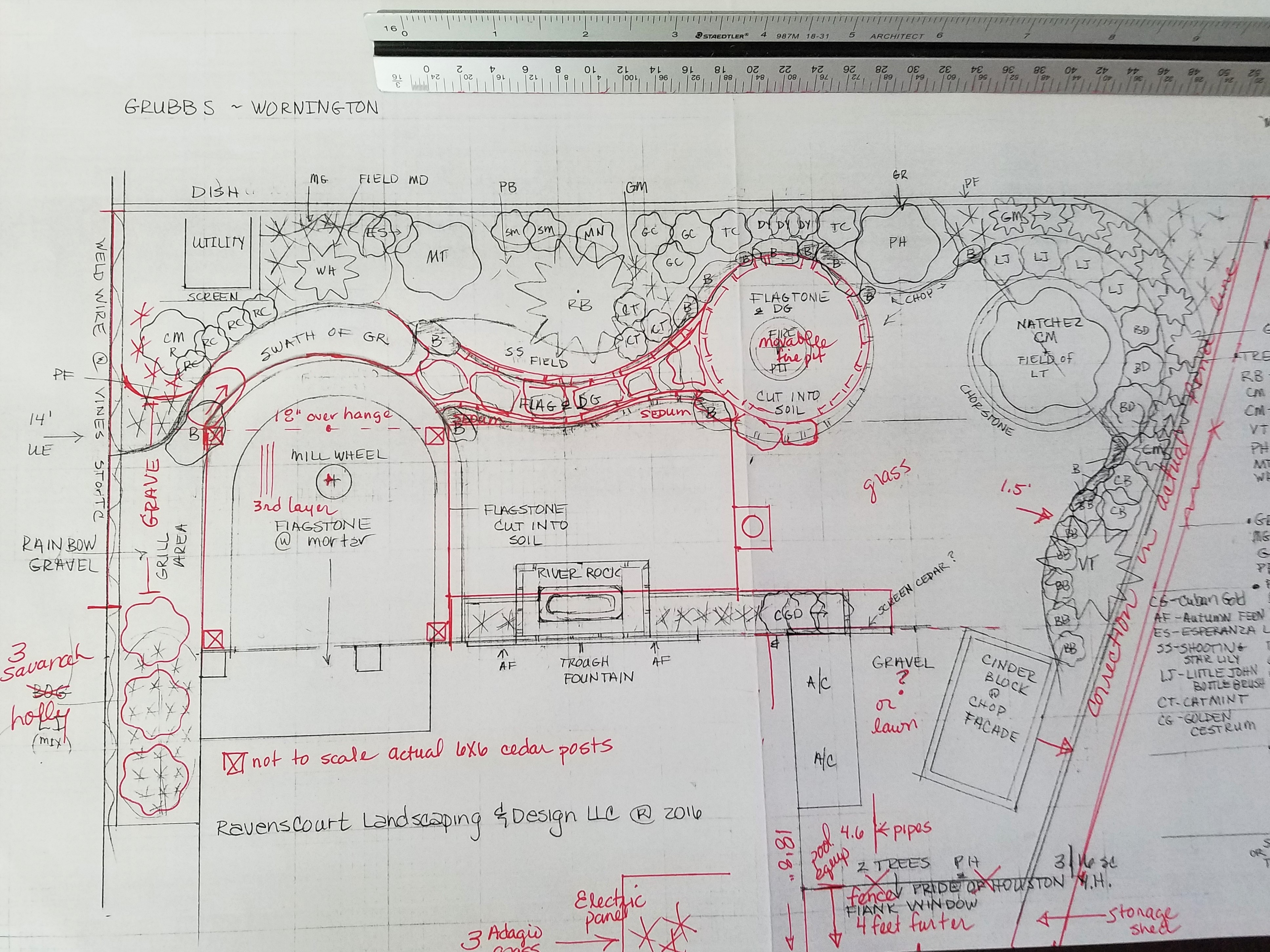 Originally the design had a water feature near a large patio. Placing the pool took several passes with various shapes from kidney to rectangular.