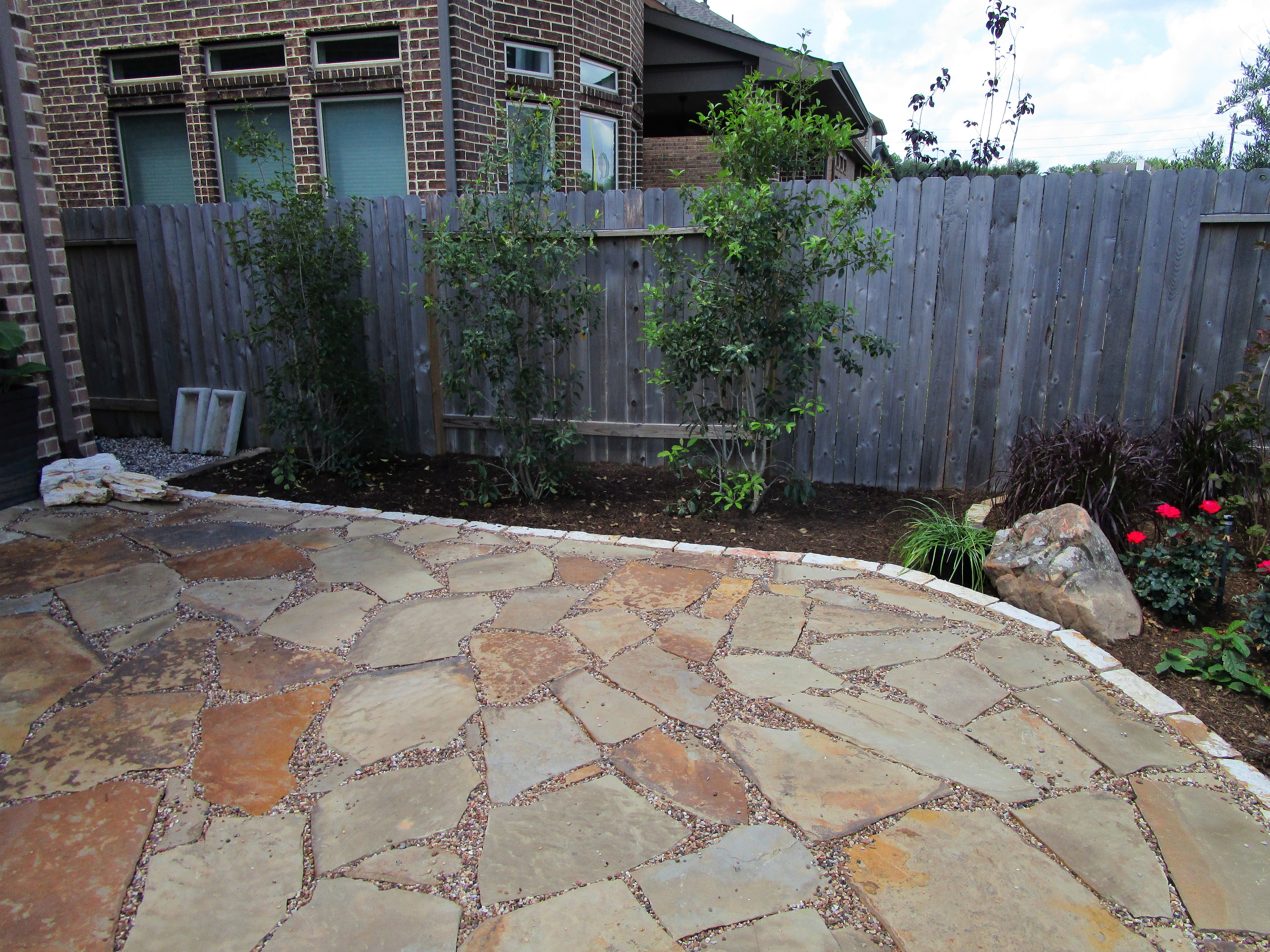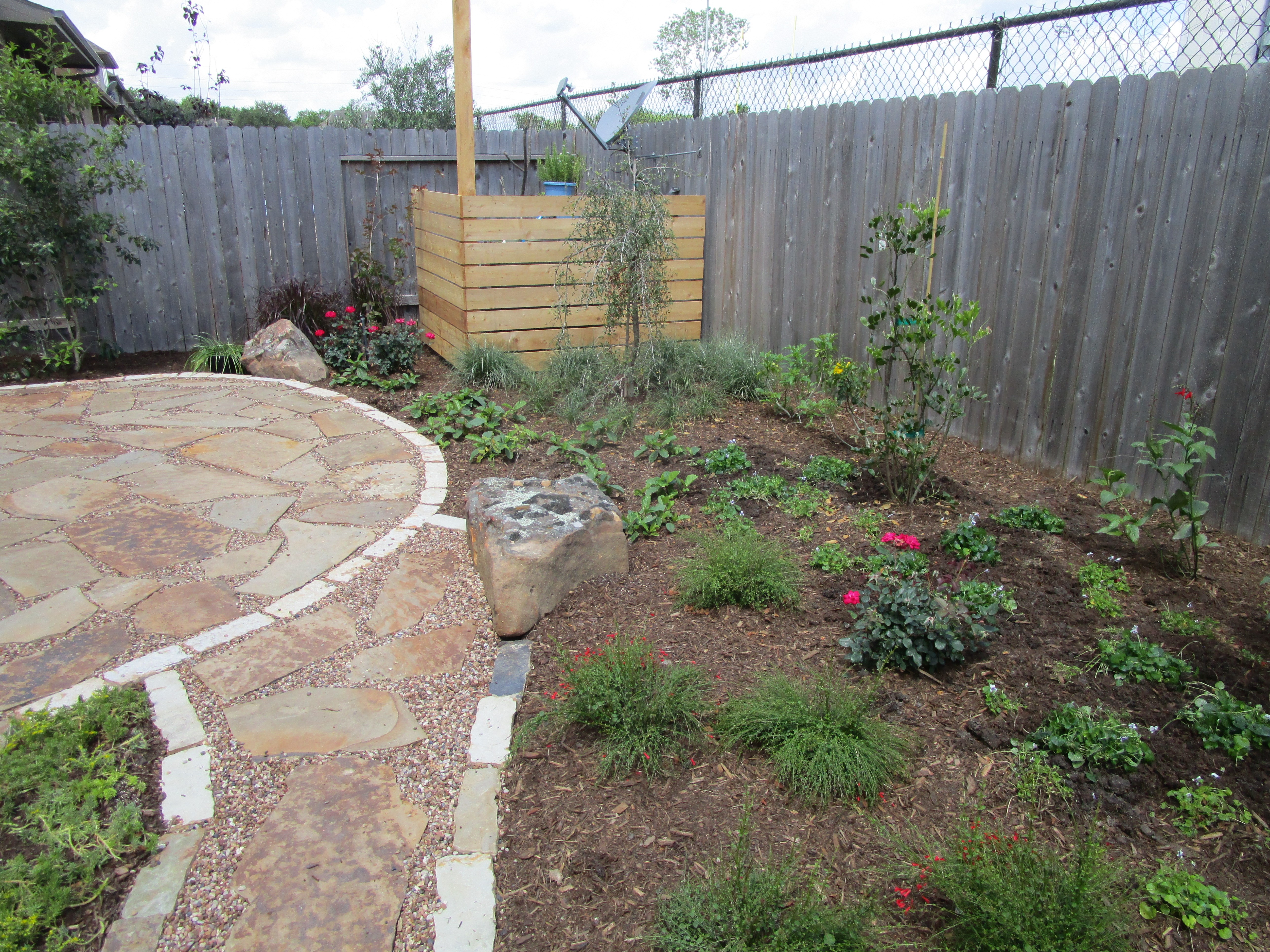 Taken from the path looking west. Between us and the screen is a Weeping Yaupon Holly and closer to us a Texas Mountain Laurel. These are both considered small trees that are attractive with seasonal changes but will never out grow the space.