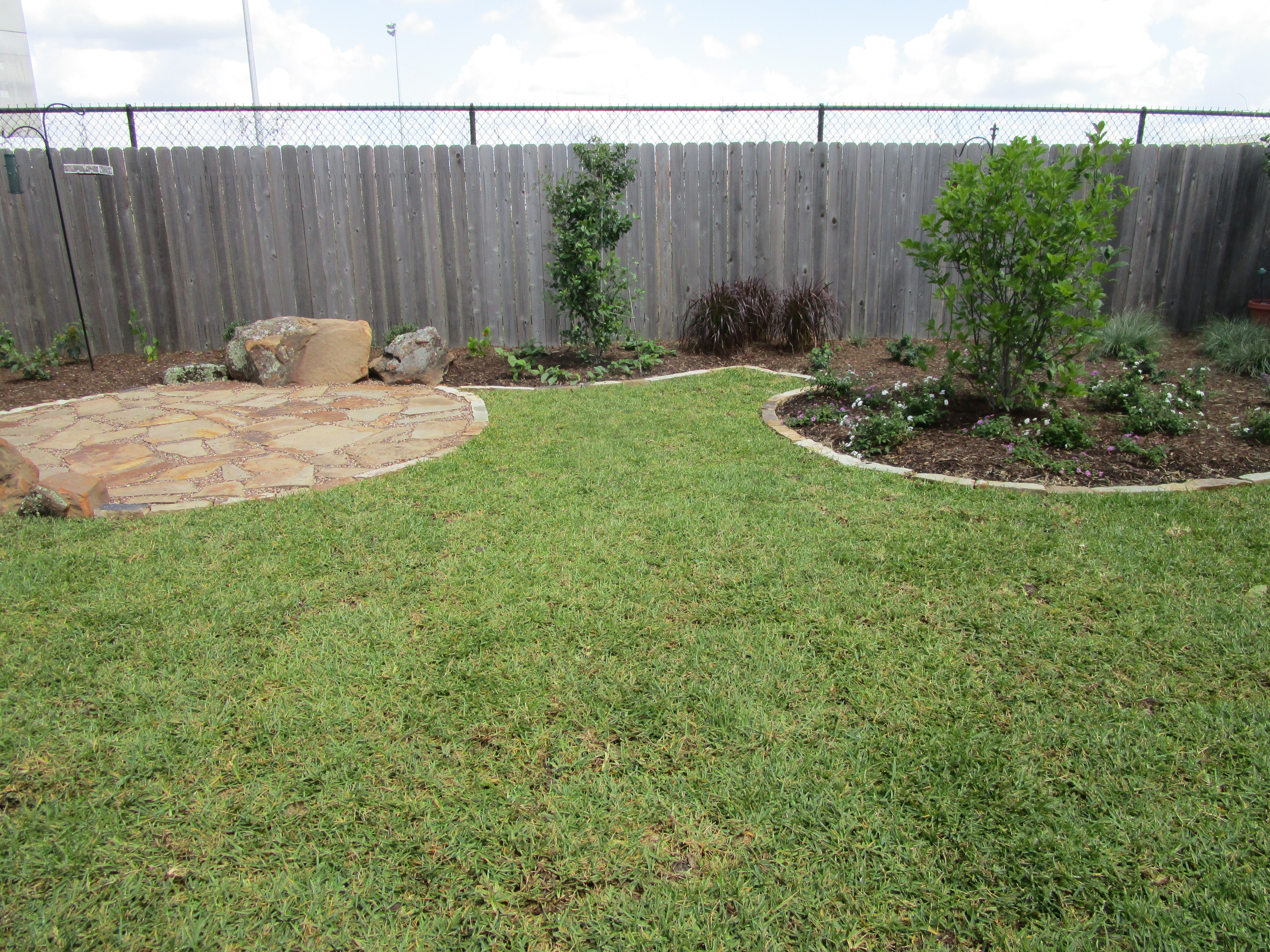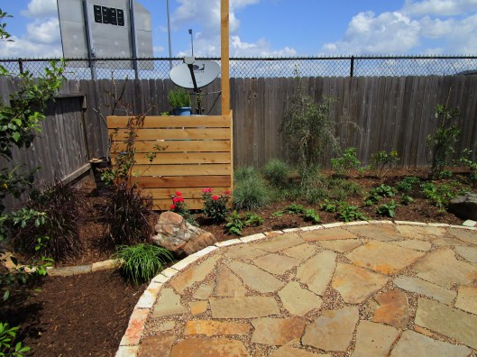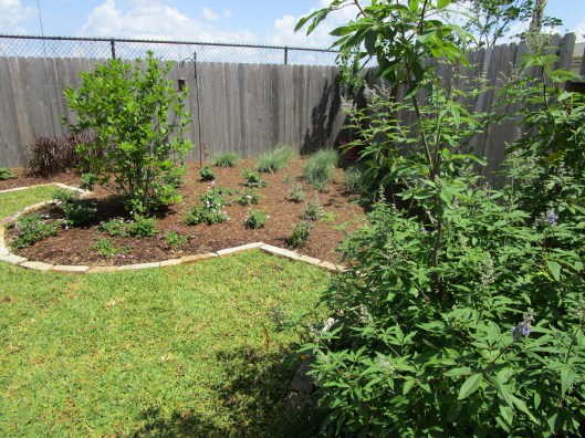 Here are a couple of shots looking back to the west from the small patio. The Dura Heat® River Birch, Betula nigra ‘BNMTF’ is the biggest tree we planted; or will be. This variety does very well in Houston. Sadly we often see them planted in flower beds hitting the roof soffit. They really do need room to spread out and grow tall. I used it here to add to the woodland feel. I also enjoy the sound its leaves make when they sway in the breeze.
