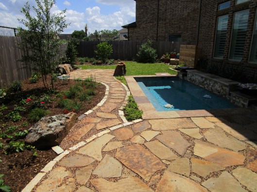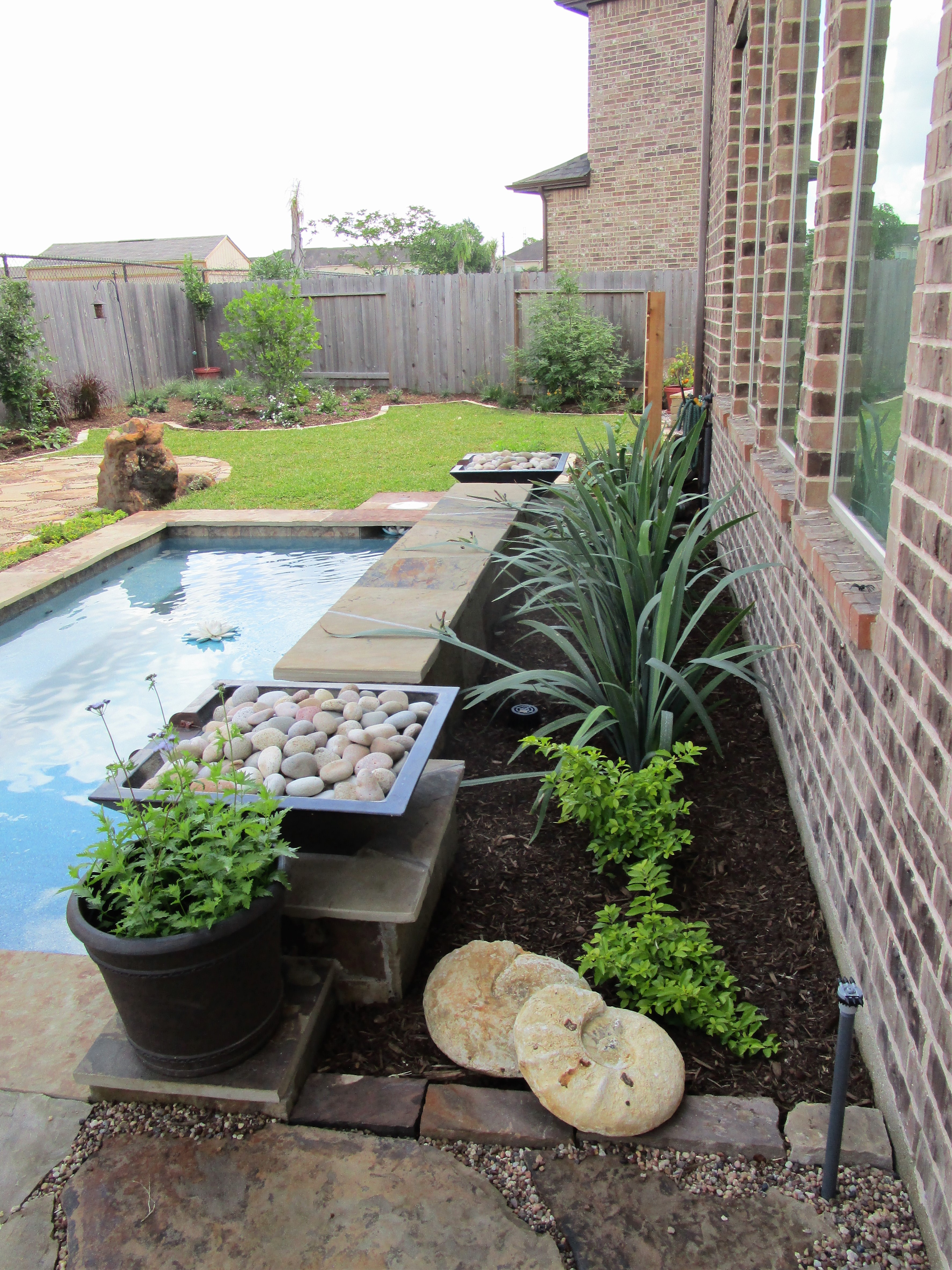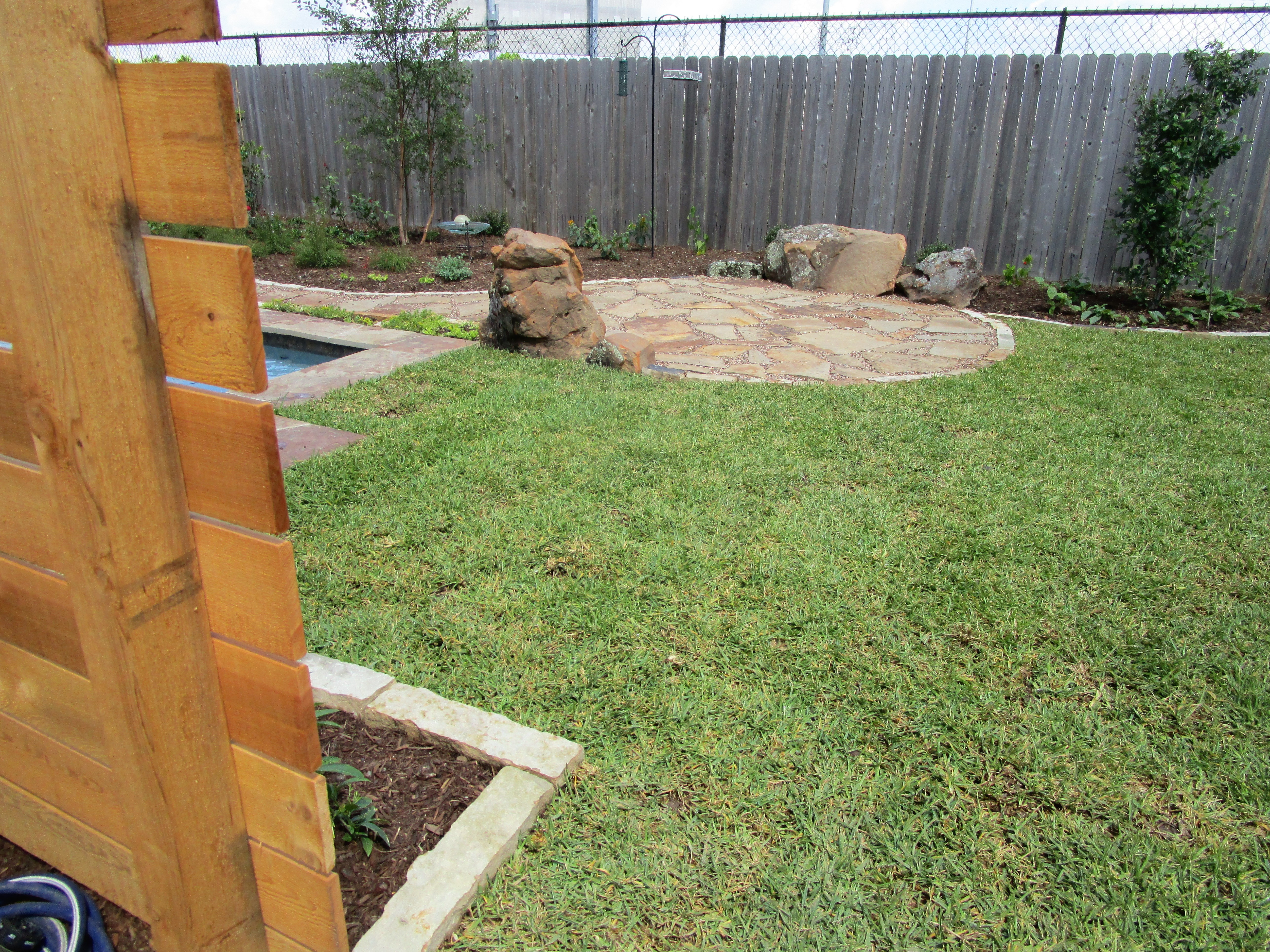 Out in the Dairy Ashford area of Houston, where lot sizes are bigger, we had plenty of room to create a naturalist back yard retreat. You may have wondered if we do larger gardens. We do but often we just do the design and not the install. This project was in the design phase when the young couple decided they wanted a pool. The utility easement constrained where they could build. In the end they went with a spa/pool called a “spool”, a new word in my vocabulary. Here are a couple of before shots of the blank slate we started with.