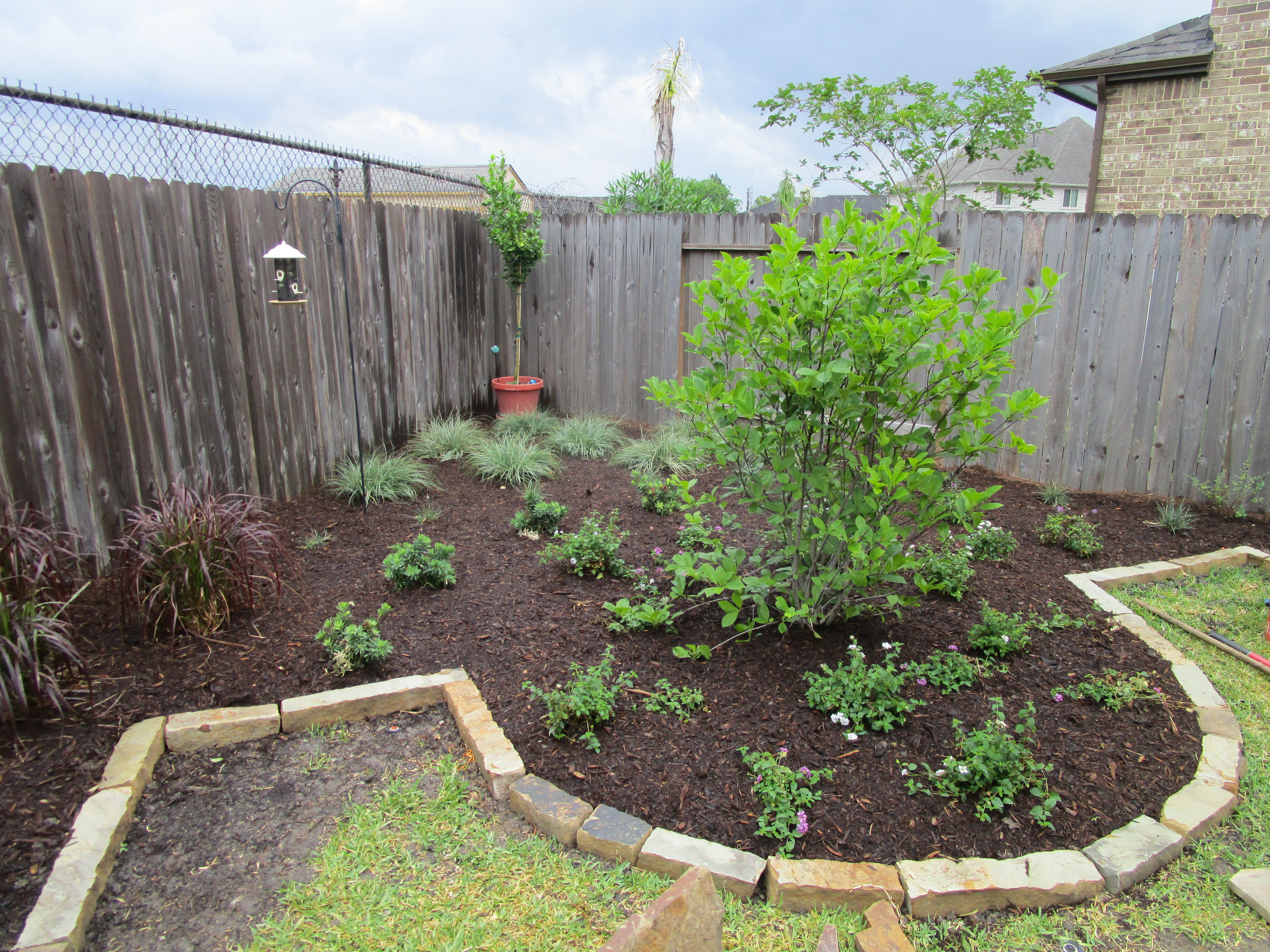 There are several grasses. The grass in the background is Miscanthus “Adagio” Maiden grass that will fill in and obscure the fence. Around the tree we have Purple and White Trailing lantana that will be in bloom for nearly 9 months here in Houston.
