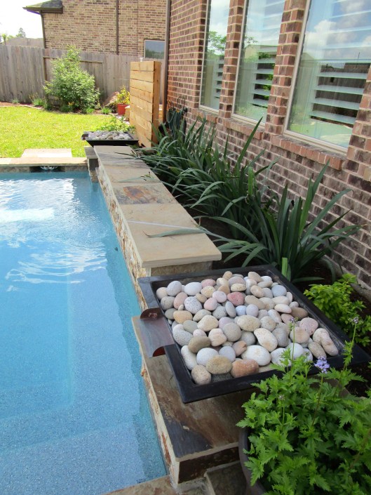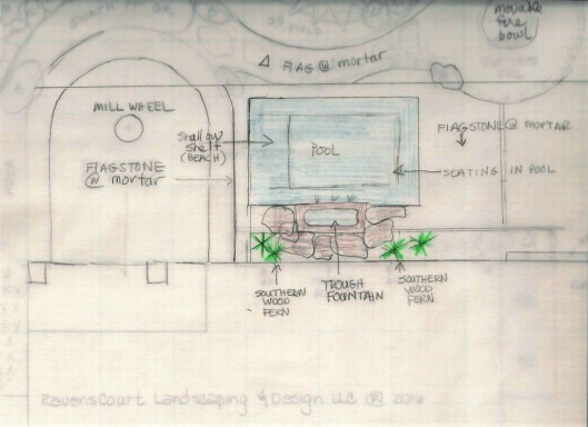 We consulted during the pool planning phase on size, shape and placement of the pool while the couple also got ideas from various pool companies. I suggested a rectangle nestled up to the house similar to the original design. In the end the water-feature was eliminated and fountains added to the pool itself.