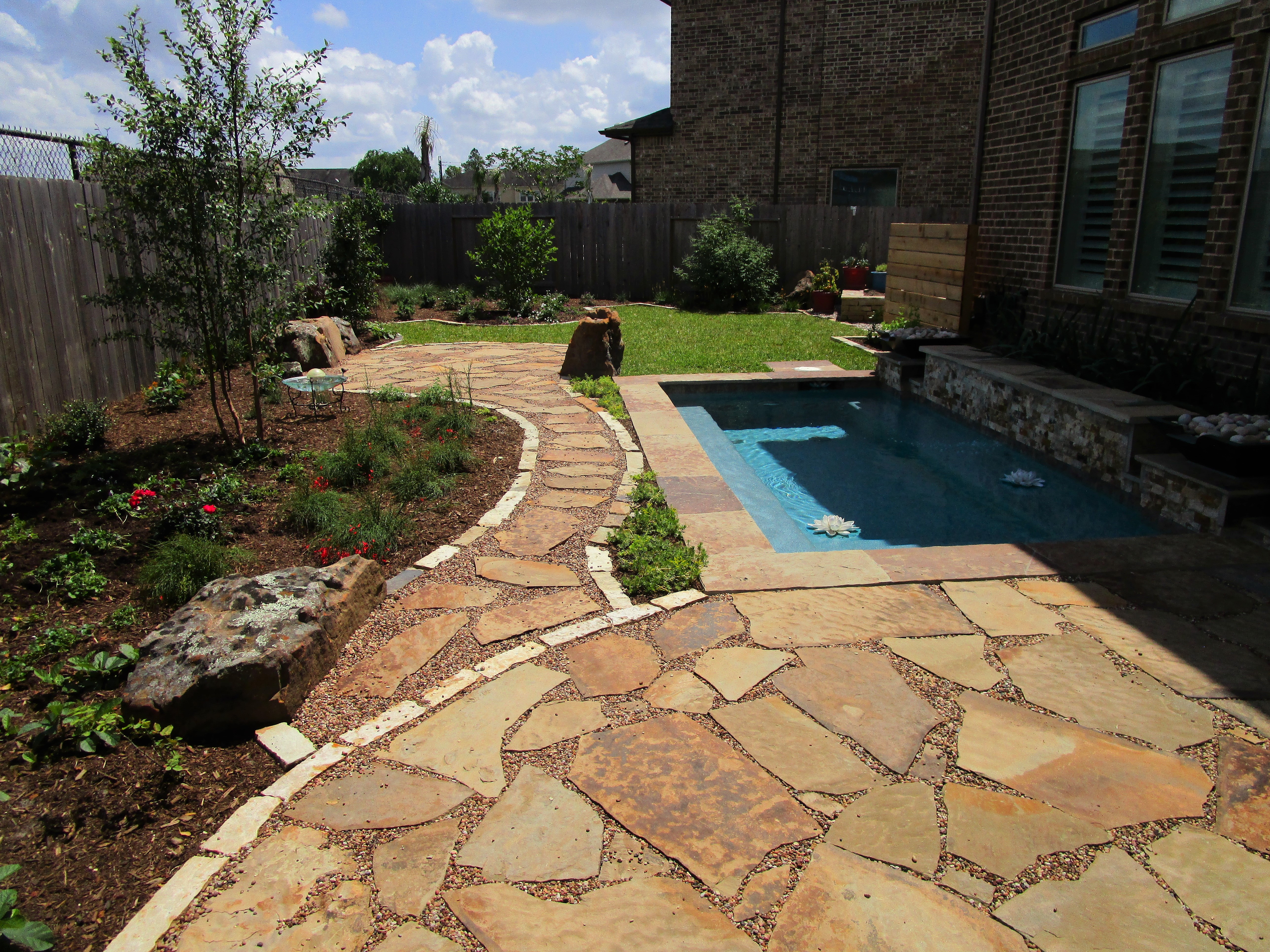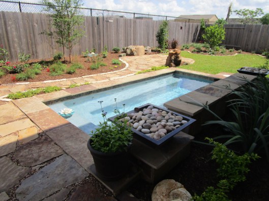 We do not install pools so we left that part to another company. We came back when the spool was completed. We started with the irrigation and then installed the hardscape and plantings, etc.. Here it is! The blue ice chest was left out daily during the installation, full of water for the crew, by the very considerate homeowner.