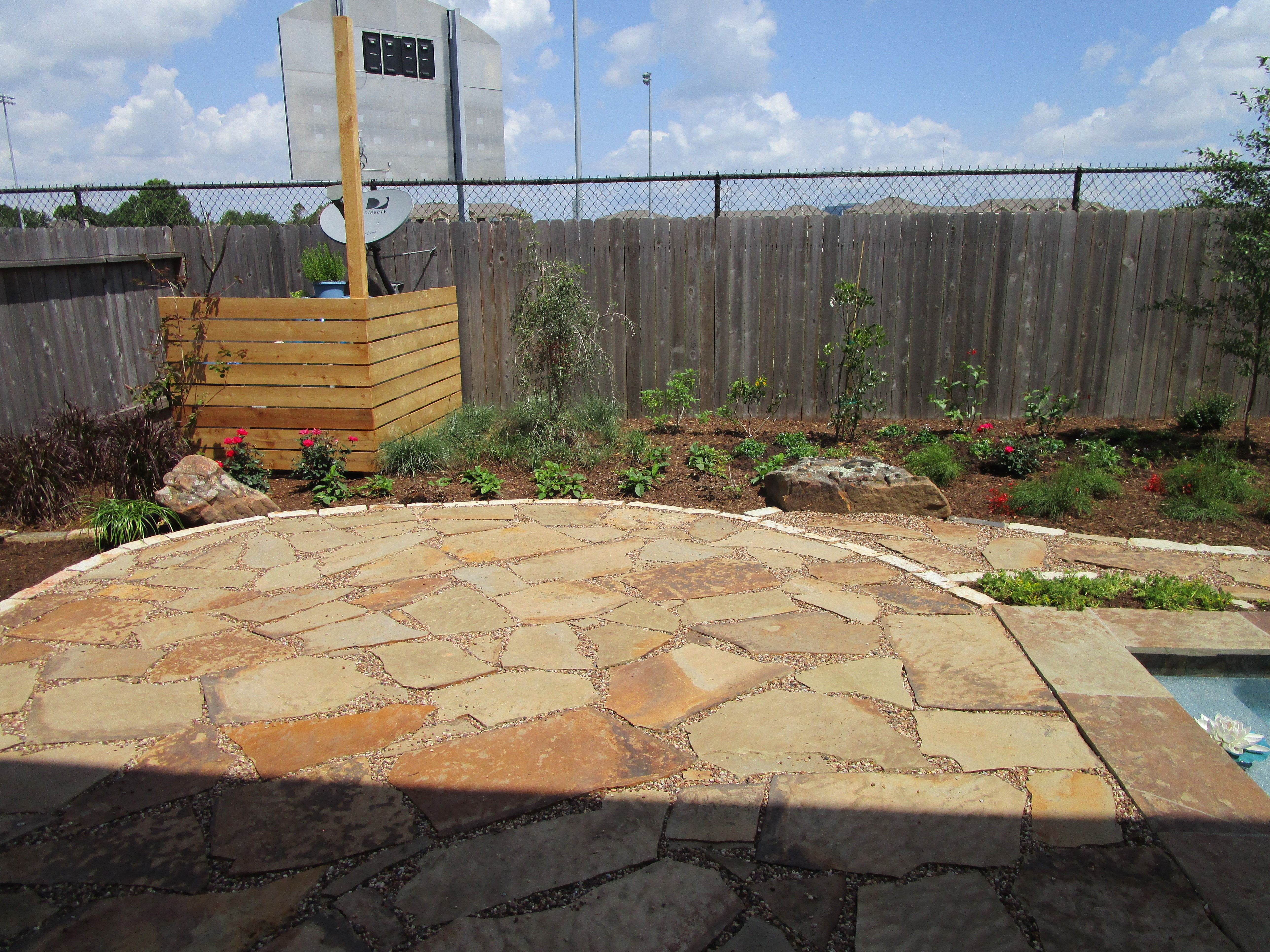 Stepping back a bit we can give you at the fire ring circle look from the vegetable garden area. The screen here is to block the view of the pool equipment and A/C units.